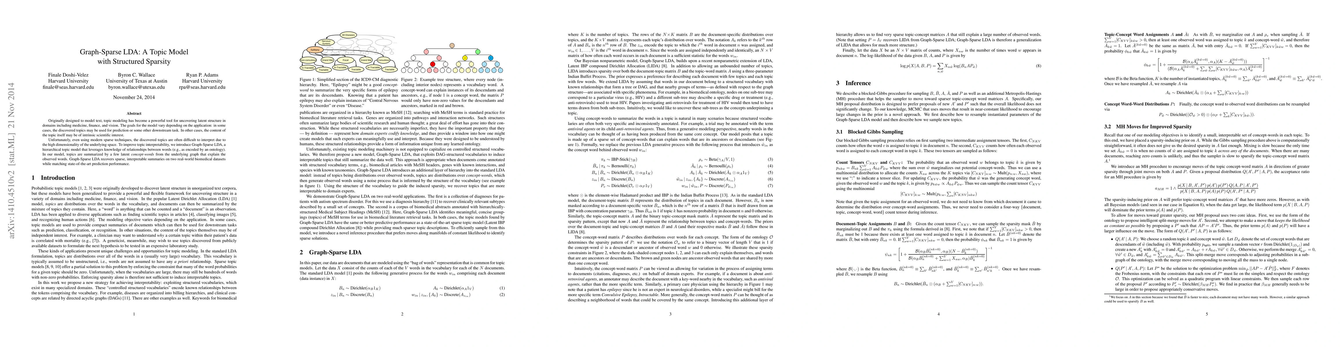 Graph-Sparse LDA introduces a hierarchical topic model that uses structured sparsity and word relationships to enhance the interpretability of discovered topics, achieving competitive predictive performance on biomedical datasets. This model summarizes topics with latent concept-words from an underlying graph, improving clarity and relevance.