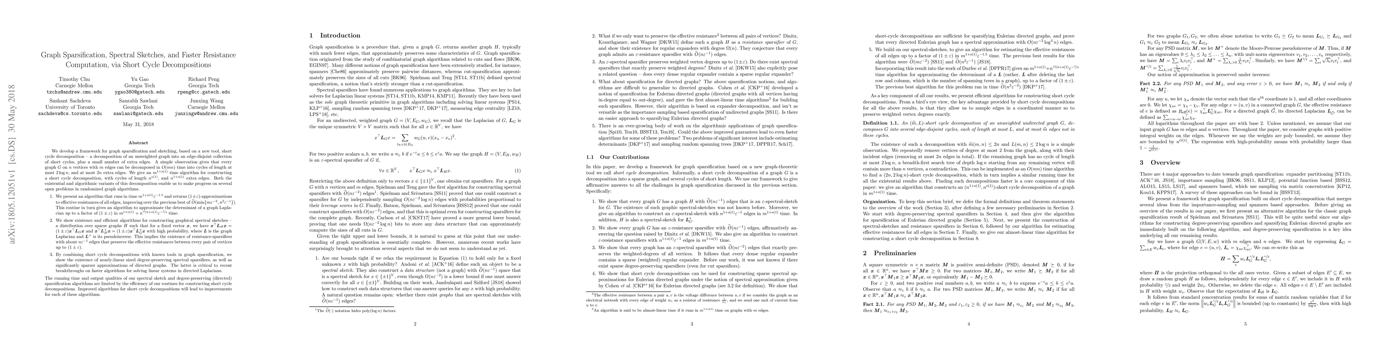 This paper introduces a novel framework for graph sparsification and sketching using short cycle decompositions, enabling faster computation of effective resistances and construction of spectral sketches. The proposed decomposition algorithm runs in $m^{1+o(1)}$ time and improves the approximation of effective resistances and Laplacian determinants.