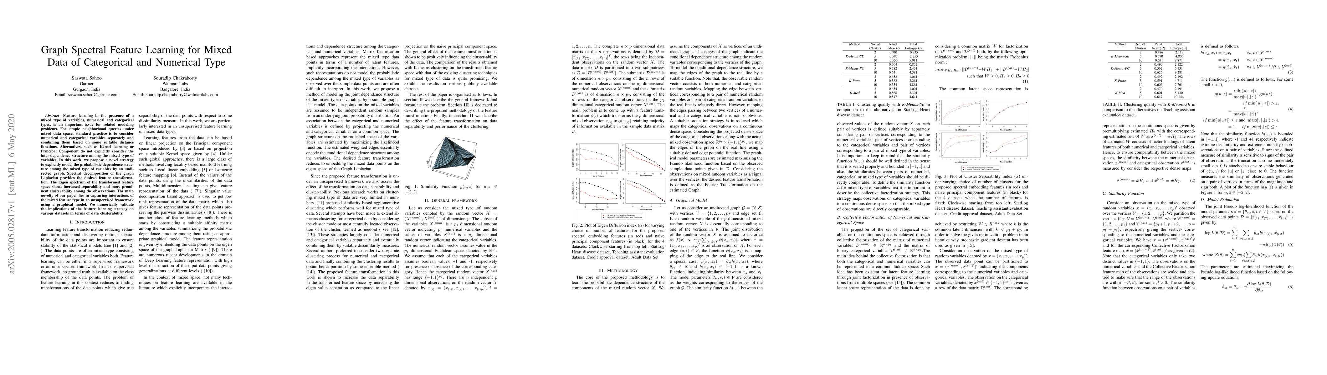 Feature learning in the presence of a mixed type of variables, numerical and categorical types, is an important issue for related modeling problems. For simple neighborhood queries under mixed data space, standard practice is to consider numerical and categorical variables separately and combining them based on some suitable distance functions. Alternatives, such as Kernel learning or Principal Component do not explicitly consider the inter-dependence structure among the mixed type of variables. In this work, we propose a novel strategy to explicitly model the probabilistic dependence structure among the mixed type of variables by an undirected graph. Spectral decomposition of the graph Laplacian provides the desired feature transformation. The Eigen spectrum of the transformed feature space shows increased separability and more prominent clusterability among the observations. The main novelty of our paper lies in capturing interactions of the mixed feature type in an unsupervised framework using a graphical model. We numerically validate the implications of the feature learning strategy