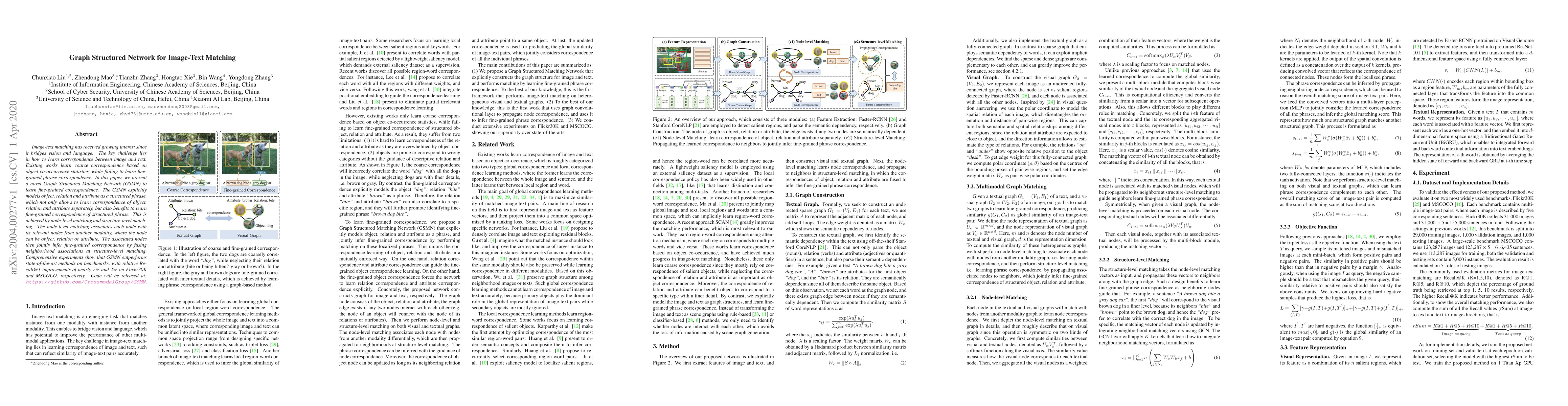 Image-text matching has received growing interest since it bridges vision and language. The key challenge lies in how to learn correspondence between image and text. Existing works learn coarse correspondence based on object co-occurrence statistics, while failing to learn fine-grained phrase correspondence. In this paper, we present a novel Graph Structured Matching Network (GSMN) to learn fine-grained correspondence. The GSMN explicitly models object, relation and attribute as a structured phrase, which not only allows to learn correspondence of object, relation and attribute separately, but also benefits to learn fine-grained correspondence of structured phrase. This is achieved by node-level matching and structure-level matching. The node-level matching associates each node with its relevant nodes from another modality, where the node can be object, relation or attribute. The associated nodes then jointly infer fine-grained correspondence by fusing neighborhood associations at structure-level matching. Comprehensive experiments show that GSMN outperforms state-of-the-art methods on benchmarks, with relative Recall@1 improvements of nearly 7% and 2% on Flickr30K and MSCOCO, respectively. Code will be released at: https://github.com/CrossmodalGroup/GSMN.