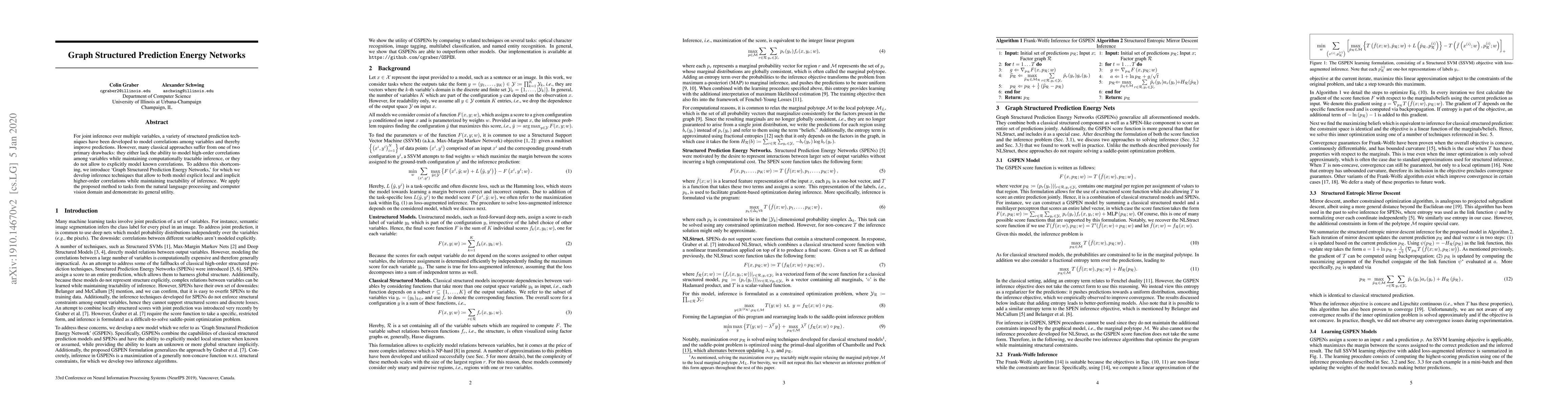 This paper introduces Graph Structured Prediction Energy Networks to model correlations among variables for joint inference, addressing the limitations of existing methods by enabling both high-order correlation modeling and tractable inference. The method is demonstrated to be effective in natural language processing and computer vision tasks.
