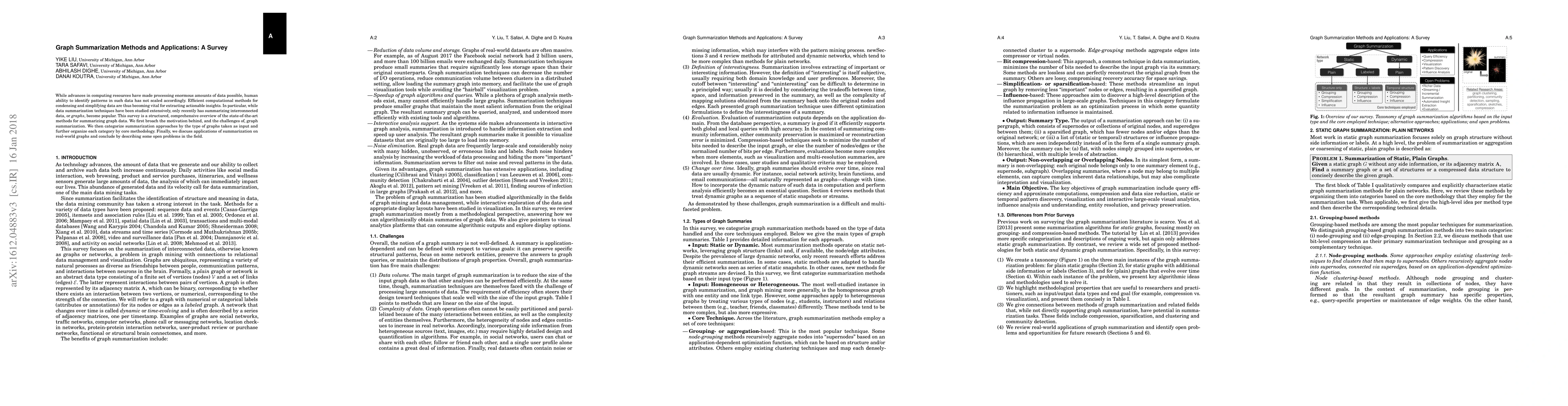 This paper surveys state-of-the-art methods for summarizing graph data, addressing the challenges and motivations behind graph summarization, categorizing approaches by input graph type and methodology, and discussing real-world applications and open problems in the field.