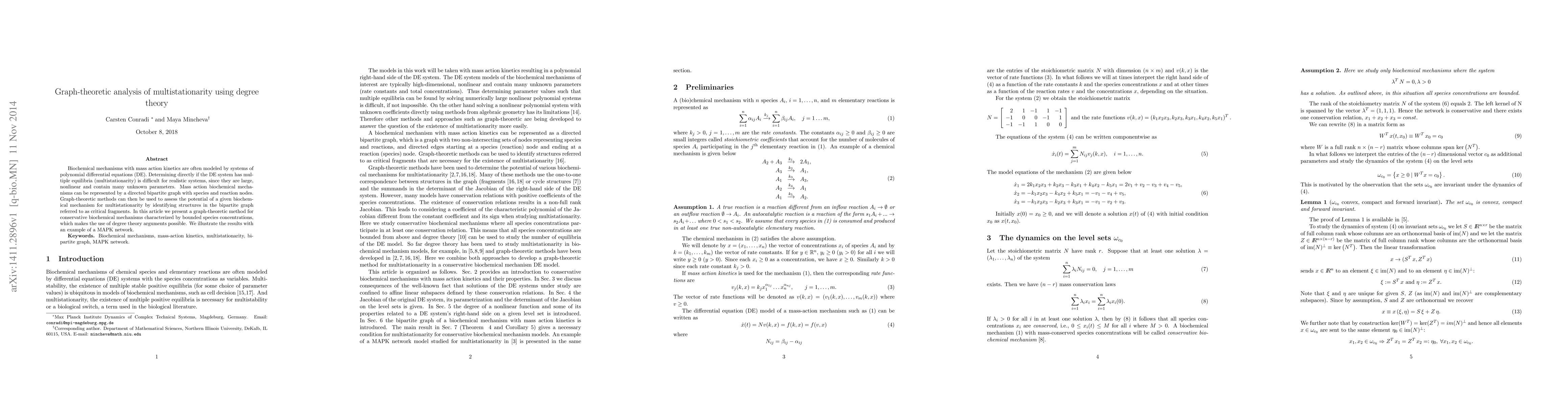 Biochemical mechanisms with mass action kinetics are often modeled by systems of polynomial differential equations (DE). Determining directly if the DE system has multiple equilibria (multistationarity) is difficult for realistic systems, since they are large, nonlinear and contain many unknown parameters. Mass action biochemical mechanisms can be represented by a directed bipartite graph with species and reaction nodes. Graph-theoretic methods can then be used to assess the potential of a given biochemical mechanism for multistationarity by identifying structures in the bipartite graph referred to as critical fragments. In this article we present a graph-theoretic method for conservative biochemical mechanisms characterized by bounded species concentrations, which makes the use of degree theory arguments possible. We illustrate the results with an example of a MAPK network.