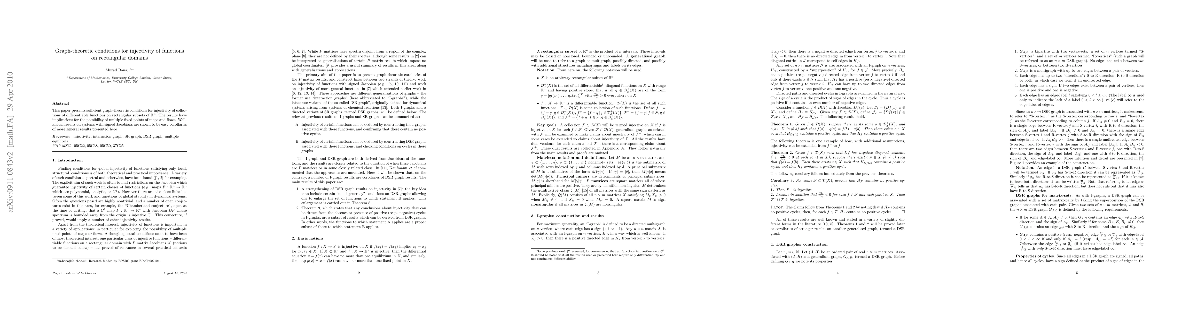 This paper establishes sufficient graph-theoretic conditions for the injectivity of differentiable functions on rectangular domains in R^n. It also explores implications for the existence of multiple fixed points in maps and flows, demonstrating that known results on systems with signed Jacobians are special cases of its broader findings.