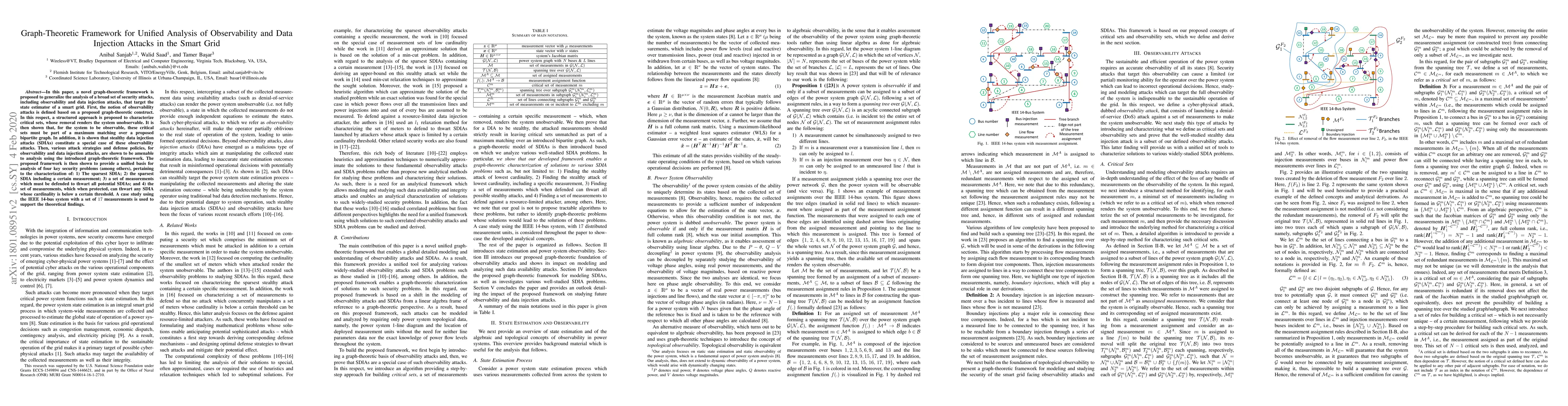 A graph-theoretic framework is proposed to analyze observability and data injection attacks in smart grids, providing a unified basis for characterizing key security problems.