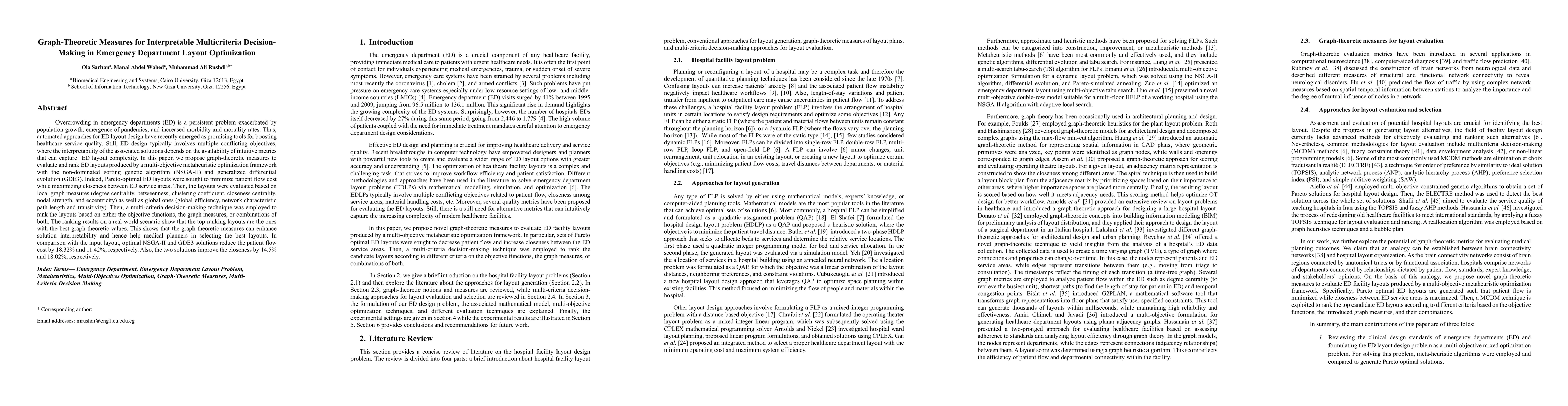 The paper presents a novel approach to ED layout optimization using graph-theoretic measures, enhancing the interpretability of Pareto solutions and providing a framework for ranking layouts based on objective functions and graph measures.