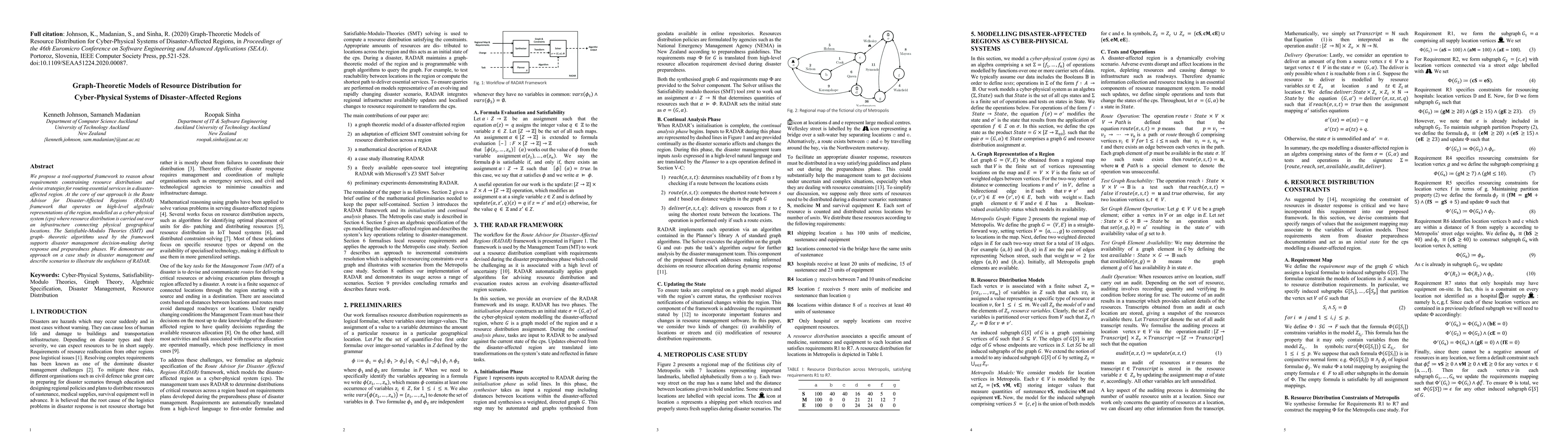 We propose a tool-supported framework to reason about requirements constraining resource distributions and devise strategies for routing essential services in a disaster-affected region. At the core of our approach is the Route Advisor for Disaster-Affected Regions (RADAR) framework that operates on high-level algebraic representations of the region, modelled as a cyber-physical system (cps) where resource distribution is carried out over an infrastructure connecting physical geographical locations. The Satisfiable-Modulo Theories (SMT) and graph-theoretic algorithms used by the framework supports disaster management decision-making during response and preparedness phases. We demonstrate our approach on a case study in disaster management and describe scenarios to illustrate the usefulness of RADAR.