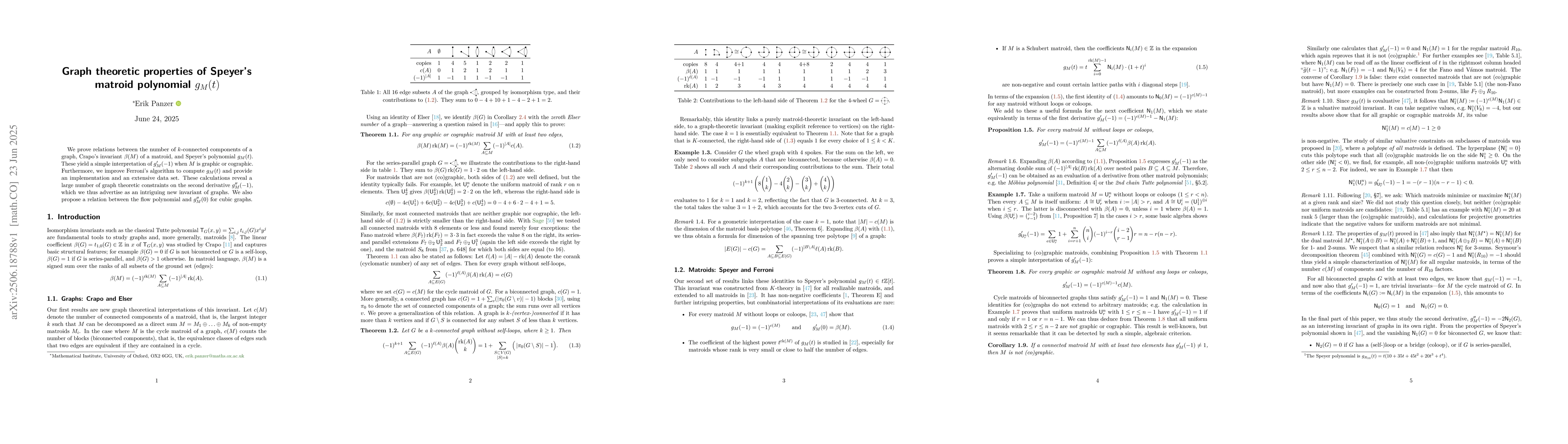 This paper establishes connections between graph connectivity, matroid invariants, and Speyer's polynomial $g_M(t)$. It refines Ferroni's algorithm for computing $g_M(t)$ and uncovers numerous graph-theoretic constraints on its second derivative at $-1$. The authors also propose a relationship between the flow polynomial and the second derivative of $g_M(t)$ at 0 for cubic graphs, introducing $g_M''(-1)$ as a novel graph invariant.