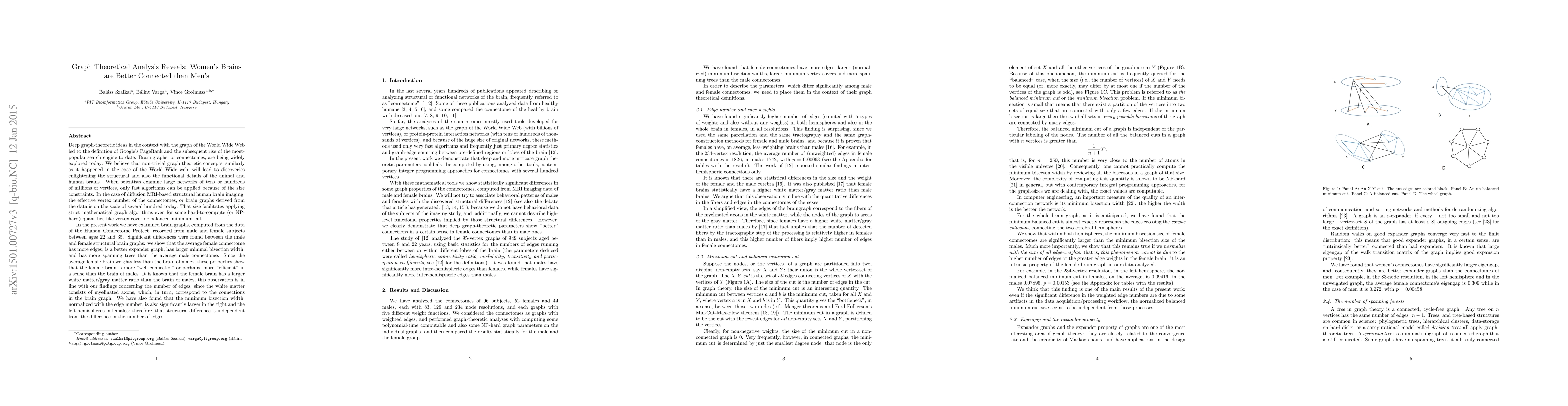 Deep graph-theoretic ideas in the context with the graph of the World Wide Web led to the definition of Google's PageRank and the subsequent rise of the most-popular search engine to date. Brain graphs, or connectomes, are being widely explored today. We believe that non-trivial graph theoretic concepts, similarly as it happened in the case of the World Wide web, will lead to discoveries enlightening the structural and also the functional details of the animal and human brains. When scientists examine large networks of tens or hundreds of millions of vertices, only fast algorithms can be applied because of the size constraints. In the case of diffusion MRI-based structural human brain imaging, the effective vertex number of the connectomes, or brain graphs derived from the data is on the scale of several hundred today. That size facilitates applying strict mathematical graph algorithms even for some hard-to-compute (or NP-hard) quantities like vertex cover or balanced minimum cut. In the present work we have examined brain graphs, computed from the data of the Human Connectome Project, recorded from male and female subjects between ages 22 and 35. Significant differences were found between the male and female structural brain graphs: we show that the average female connectome has more edges, is a better expander graph, has larger minimal bisection width, and has more spanning trees than the average male connectome. Since the average female brain weights less than the brain of males, these properties show that the female brain is more "well-connected" or perhaps, more "efficient" in a sense than the brain of males.