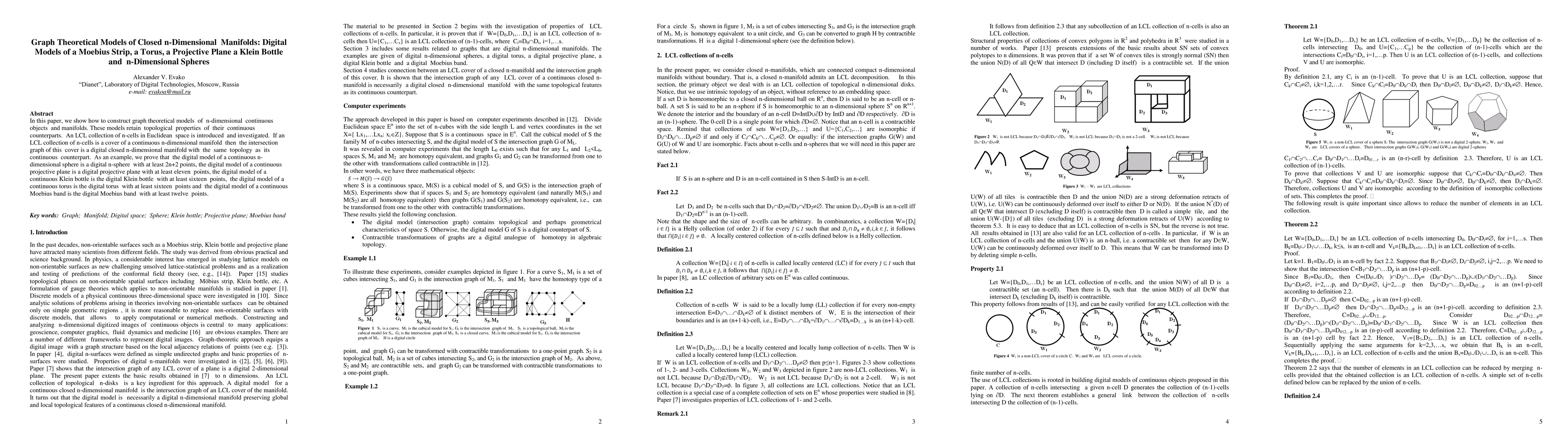This paper constructs graph theoretical models for n-dimensional continuous objects, demonstrating their topological equivalence to the original continuous manifolds. It shows that digital models of specific n-manifolds like spheres, tori, projective planes, Klein bottles, and Möbius strips retain their topological properties and specifies minimum point requirements for their digital representations.
