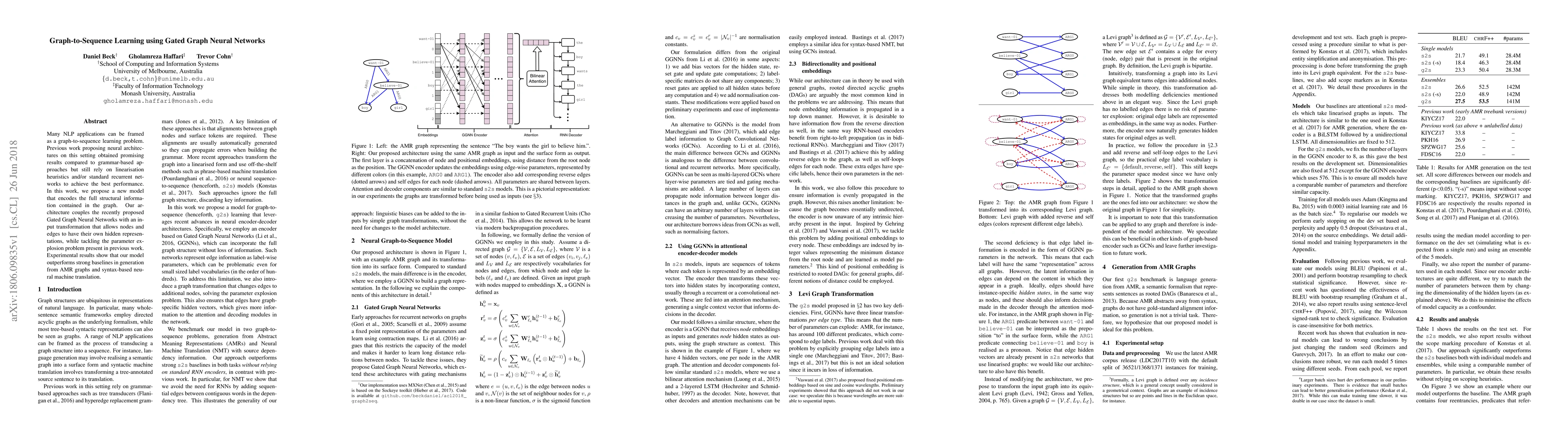 This paper introduces a new model combining Gated Graph Neural Networks with an input transformation to fully encode graph structural information, addressing parameter explosion issues. The proposed architecture outperforms existing methods in graph-to-sequence tasks like AMR graph generation and syntax-based neural machine translation.