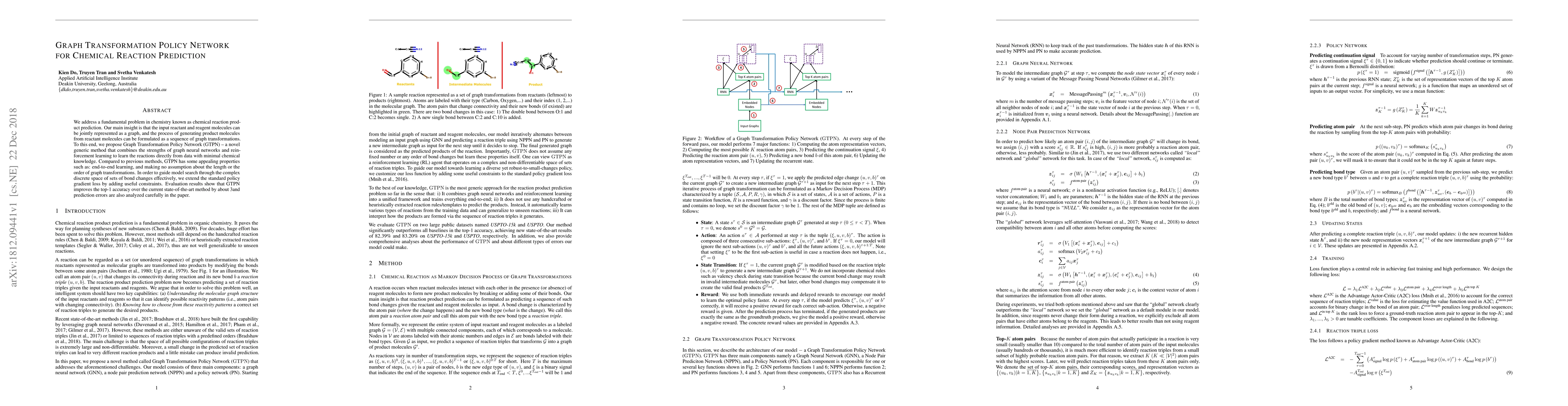 This paper proposes the Graph Transformation Policy Network (GTPN) for predicting chemical reaction products by representing reactants and reagents as graphs and learning graph transformations directly from data. GTPN combines graph neural networks and reinforcement learning, achieving better accuracy than existing methods on the USPTO dataset.