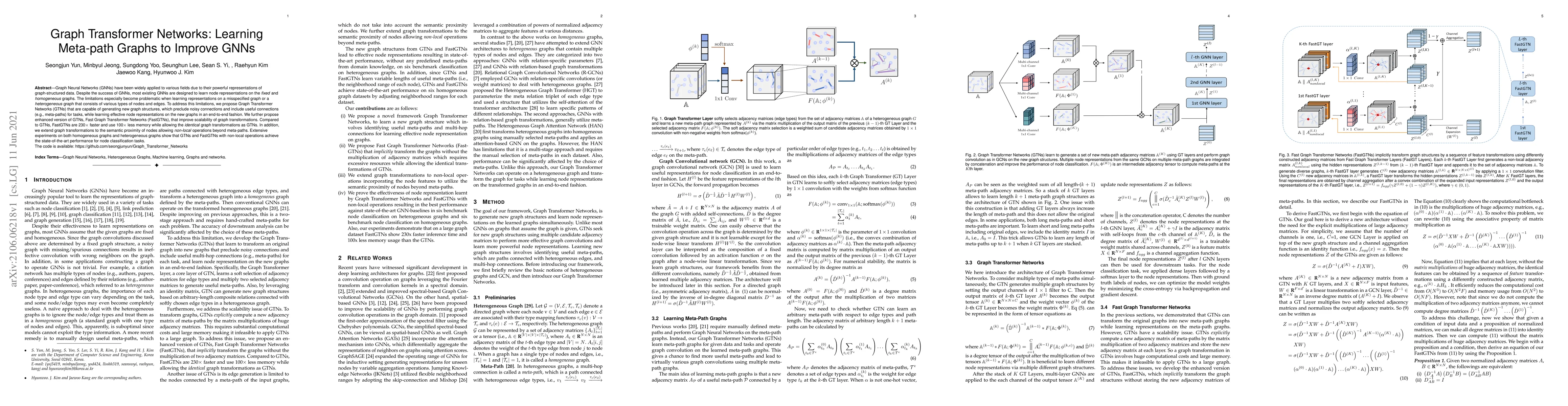 This paper proposes Graph Transformer Networks (GTNs) to improve Graph Neural Networks (GNNs) for heterogeneous and misspecified graphs by generating new graph structures that include useful connections. An enhanced version, FastGTNs, improves scalability while maintaining performance, achieving state-of-the-art results in node classification tasks.