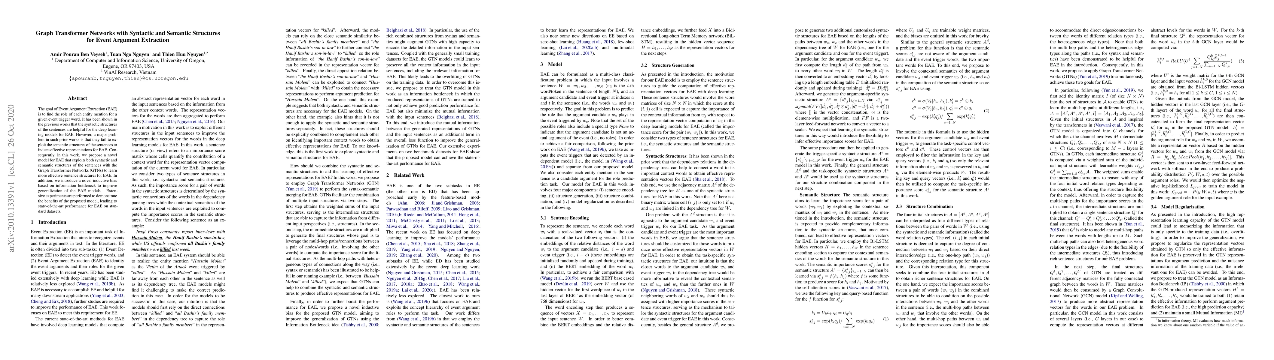 This paper proposes a Graph Transformer Networks (GTNs) model that integrates both syntactic and semantic structures to enhance Event Argument Extraction (EAE), achieving state-of-the-art results by leveraging an information bottleneck inductive bias for better generalization.