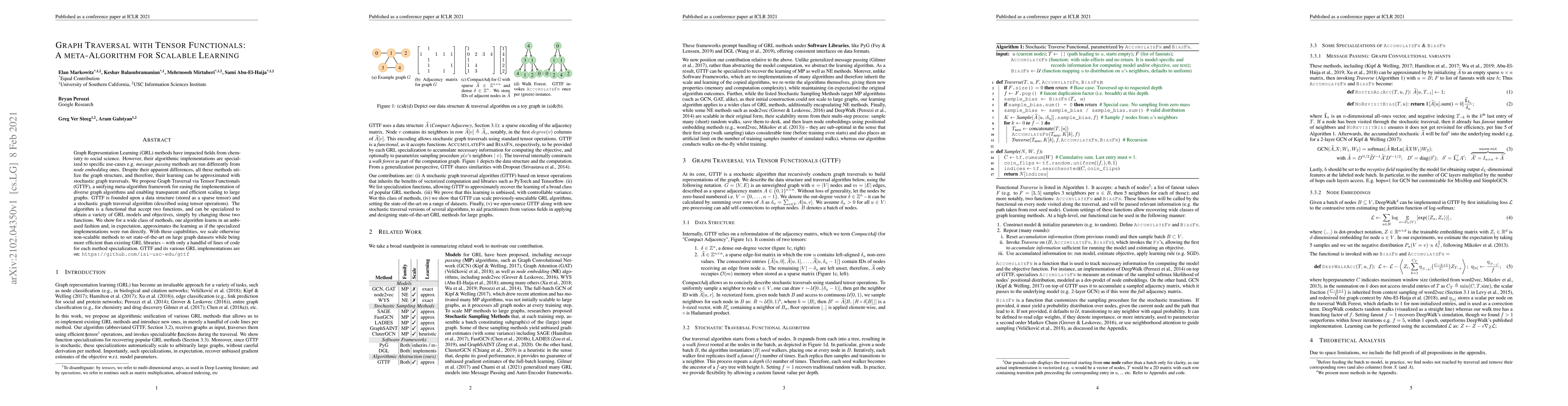 Graph Representation Learning (GRL) methods have impacted fields from chemistry to social science. However, their algorithmic implementations are specialized to specific use-cases e.g.message passing methods are run differently from node embedding ones. Despite their apparent differences, all these methods utilize the graph structure, and therefore, their learning can be approximated with stochastic graph traversals. We propose Graph Traversal via Tensor Functionals(GTTF), a unifying meta-algorithm framework for easing the implementation of diverse graph algorithms and enabling transparent and efficient scaling to large graphs. GTTF is founded upon a data structure (stored as a sparse tensor) and a stochastic graph traversal algorithm (described using tensor operations). The algorithm is a functional that accept two functions, and can be specialized to obtain a variety of GRL models and objectives, simply by changing those two functions. We show for a wide class of methods, our algorithm learns in an unbiased fashion and, in expectation, approximates the learning as if the specialized implementations were run directly. With these capabilities, we scale otherwise non-scalable methods to set state-of-the-art on large graph datasets while being more efficient than existing GRL libraries - with only a handful of lines of code for each method specialization. GTTF and its various GRL implementations are on: https://github.com/isi-usc-edu/gttf.