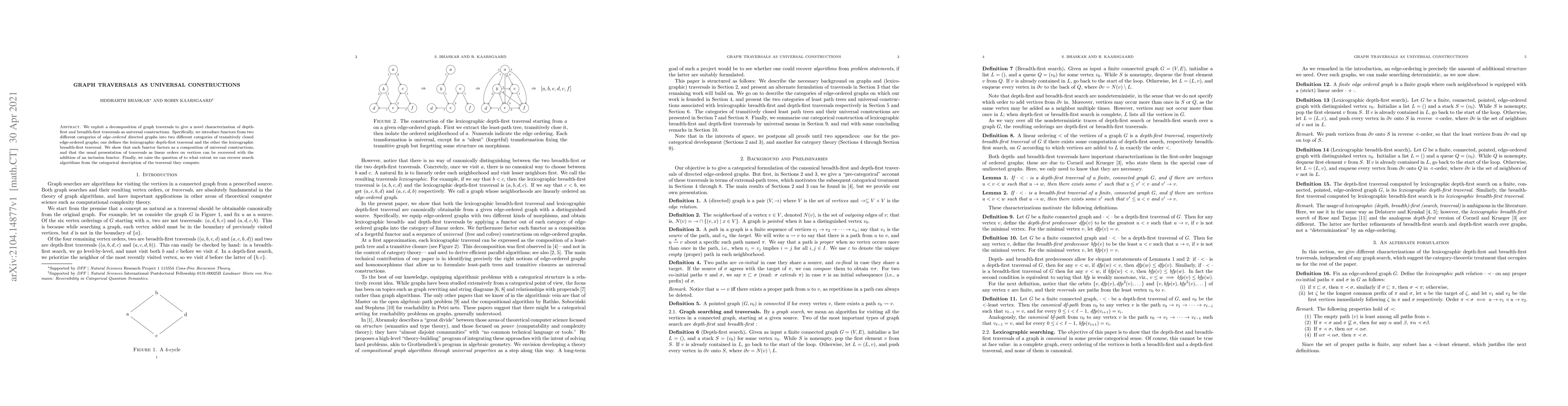 This paper characterizes depth-first and breadth-first traversals as universal constructions using functors between categories of edge-ordered graphs, showing they factor into compositions of universal constructions. It also explores the possibility of recovering search algorithms from these categorical descriptions.
