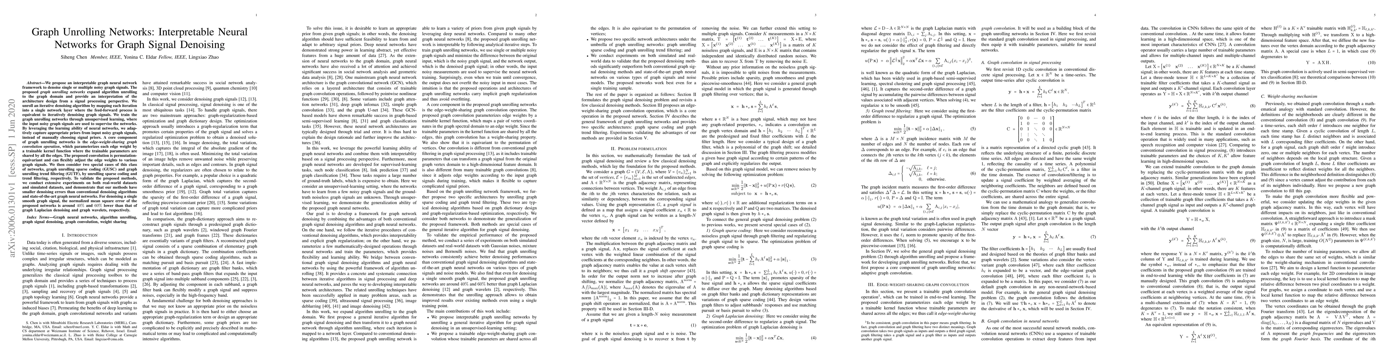 This paper introduces graph unrolling networks, an interpretable framework for denoising graph signals using neural networks. The method unrolls an iterative denoising algorithm into a single network layer, trained via unsupervised learning, and employs an edge-weight-sharing graph convolution for adaptive signal priors. Experiments show significant improvements over conventional denoising methods and state-of-the-art graph neural networks.