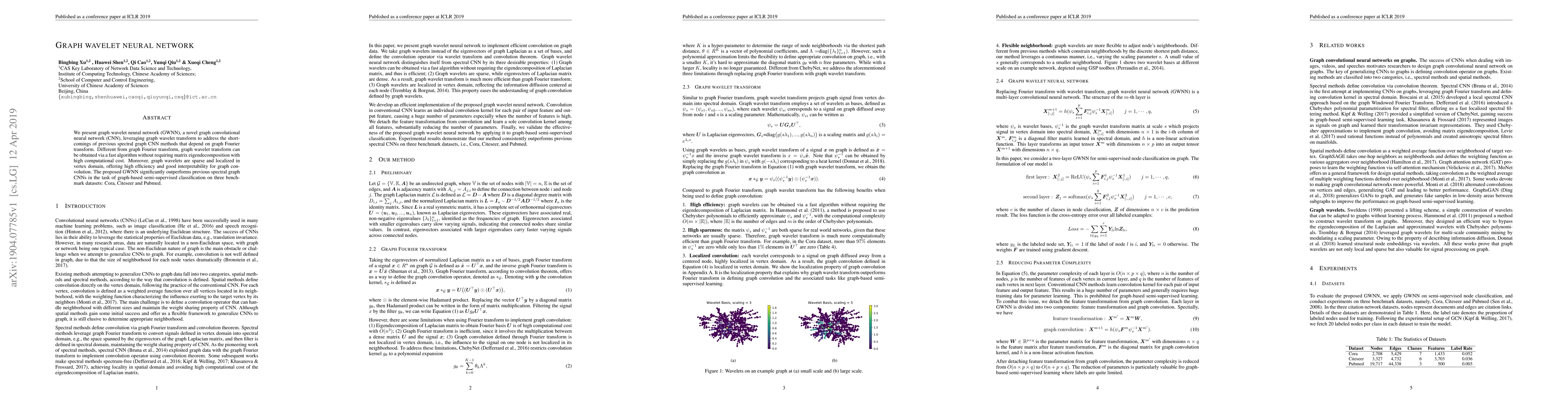 The graph wavelet neural network (GWNN) leverages graph wavelet transform for graph convolution, offering computational efficiency and interpretability over graph Fourier transform methods. GWNN outperforms previous spectral graph CNNs in semi-supervised classification tasks on Cora, Citeseer, and Pubmed datasets.