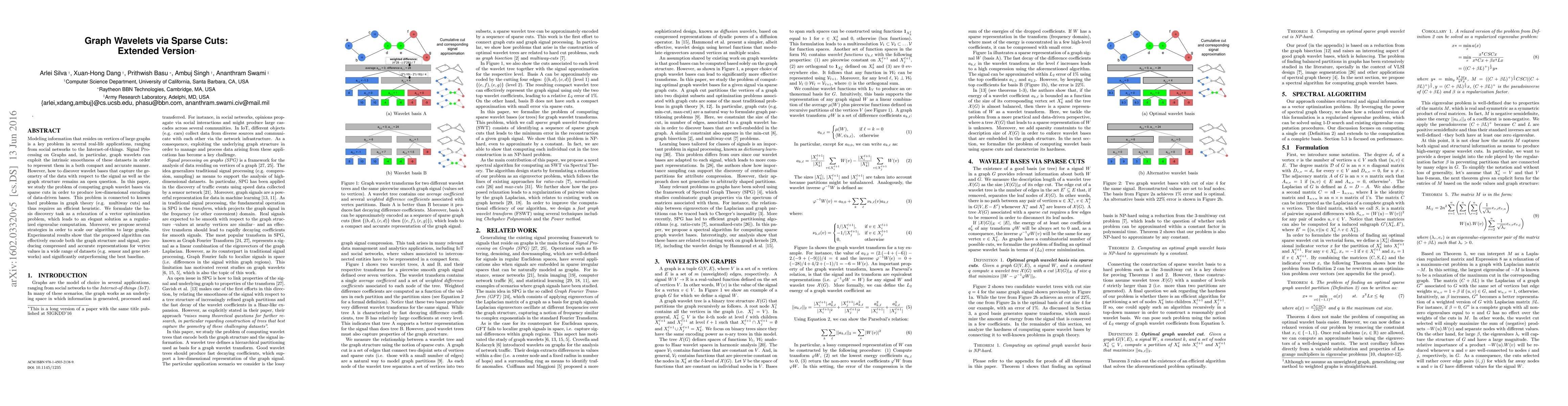 Modeling information that resides on vertices of large graphs is a key problem in several real-life applications, ranging from social networks to the Internet-of-things. Signal Processing on Graphs and, in particular, graph wavelets can exploit the intrinsic smoothness of these datasets in order to represent them in a both compact and accurate manner. However, how to discover wavelet bases that capture the geometry of the data with respect to the signal as well as the graph structure remains an open question. In this paper, we study the problem of computing graph wavelet bases via sparse cuts in order to produce low-dimensional encodings of data-driven bases. This problem is connected to known hard problems in graph theory (e.g. multiway cuts) and thus requires an efficient heuristic. We formulate the basis discovery task as a relaxation of a vector optimization problem, which leads to an elegant solution as a regularized eigenvalue computation. Moreover, we propose several strategies in order to scale our algorithm to large graphs. Experimental results show that the proposed algorithm can effectively encode both the graph structure and signal, producing compressed and accurate representations for vertex values in a wide range of datasets (e.g. sensor and gene networks) and significantly outperforming the best baseline.
