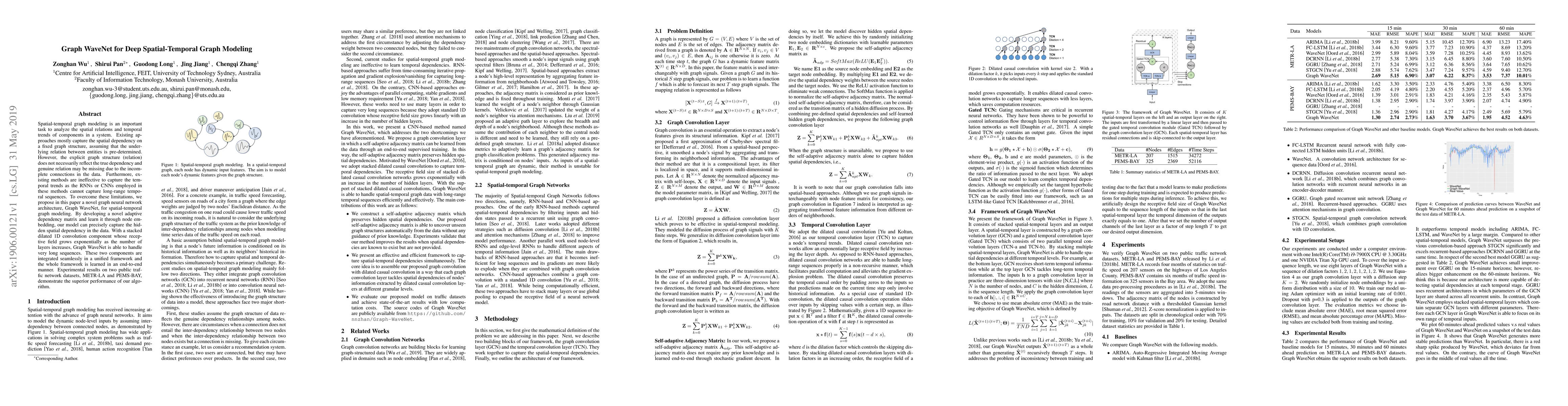 A new graph neural network architecture called Graph WaveNet is proposed to model spatial-temporal relationships in systems, overcoming limitations of existing methods that capture fixed spatial dependencies and struggle with long-range temporal sequences.