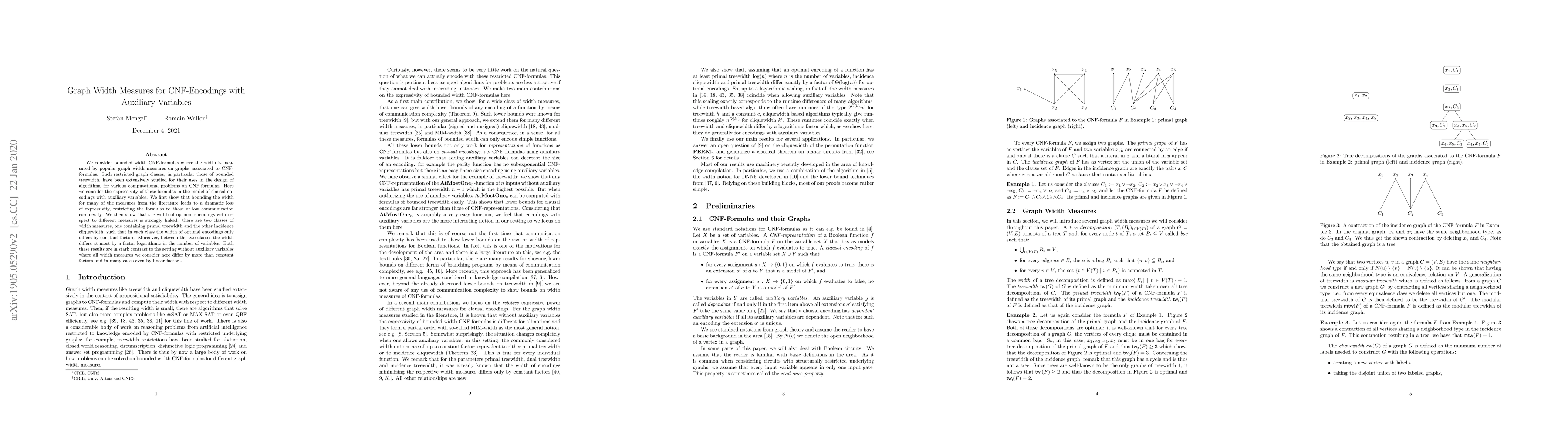 We consider bounded width CNF-formulas where the width is measured by popular graph width measures on graphs associated to CNF-formulas. Such restricted graph classes, in particular those of bounded treewidth, have been extensively studied for their uses in the design of algorithms for various computational problems on CNF-formulas. Here we consider the expressivity of these formulas in the model of clausal encodings with auxiliary variables. We first show that bounding the width for many of the measures from the literature leads to a dramatic loss of expressivity, restricting the formulas to such of low communication complexity. We then show that the width of optimal encodings with respect to different measures is strongly linked: there are two classes of width measures, one containing primal treewidth and the other incidence cliquewidth, such that in each class the width of optimal encodings only differs by constant factors. Moreover, between the two classes the width differs at most by a factor logarithmic in the number of variables. Both these results are in stark contrast to the setting without auxiliary variables where all width measures we consider here differ by more than constant factors and in many cases even by linear factors.