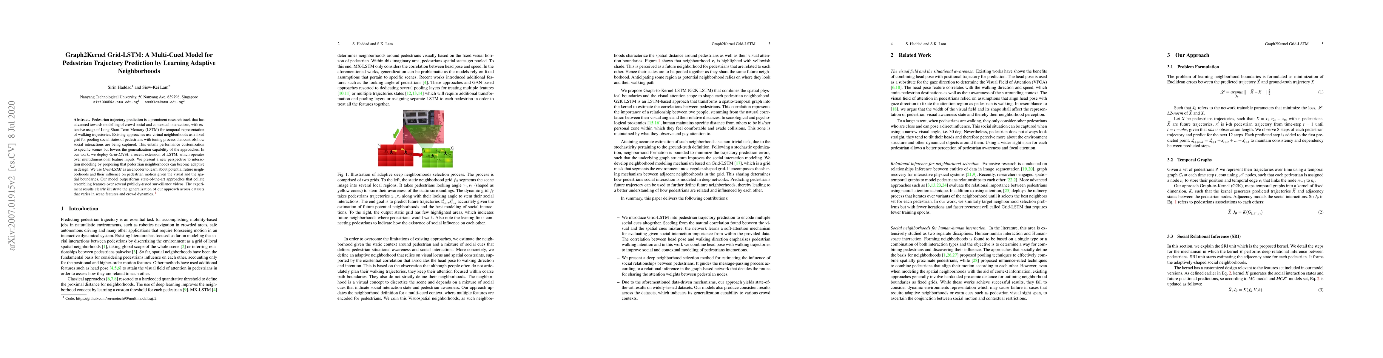 This paper proposes a new adaptive neighborhood model, Graph2Kernel Grid-LSTM, for pedestrian trajectory prediction. By using Grid-LSTM to learn adaptive neighborhoods, the model enhances generalization across different scenes and outperforms existing state-of-the-art methods on various surveillance datasets.