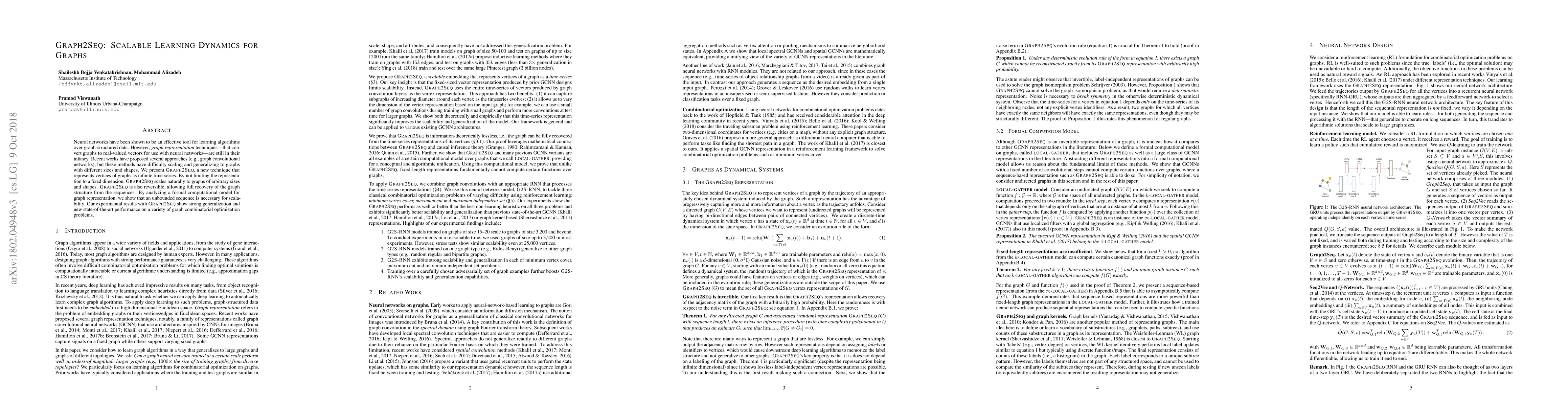 Graph2Seq represents graph vertices as infinite time-series, enabling scalable and reversible graph representation that generalizes to graphs of varying sizes and shapes. Experimental results demonstrate state-of-the-art performance on combinatorial optimization problems.