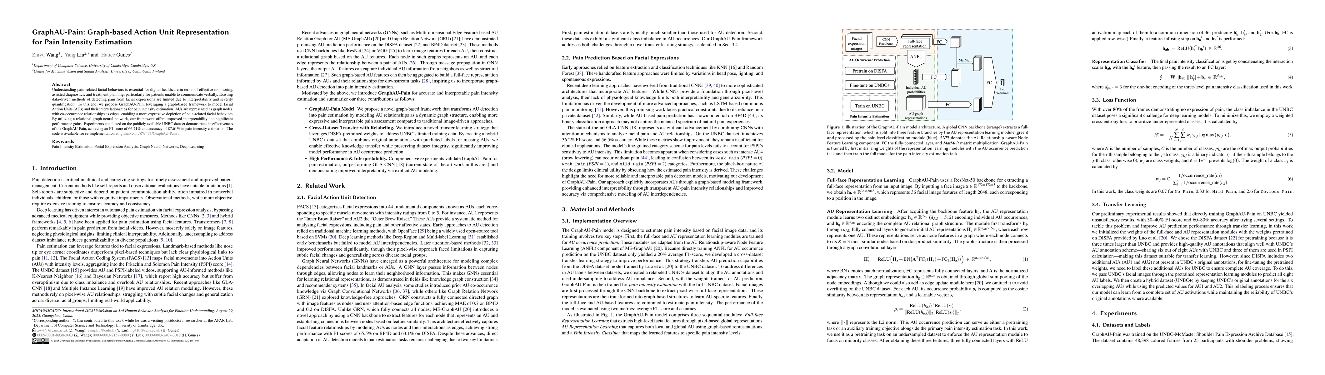 A new method called GraphAU-Pain uses graph-based representation to analyze facial Action Units for more accurate pain intensity estimation. It outperforms existing methods with an F1-score of 66.21% and accuracy of 87.61%.