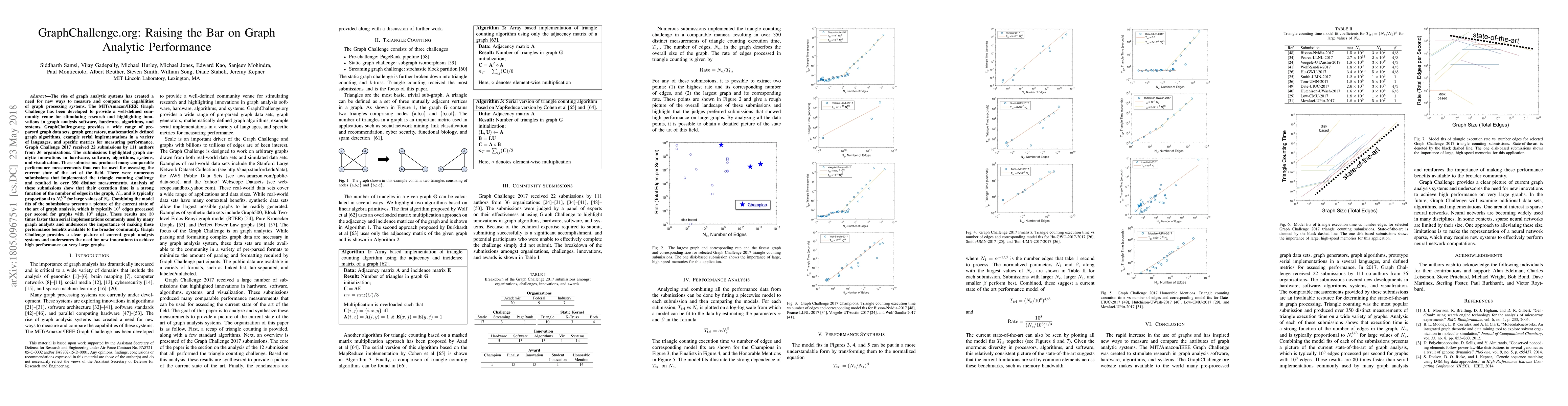 The rise of graph analytic systems has created a need for new ways to measure and compare the capabilities of graph processing systems. The MIT/Amazon/IEEE Graph Challenge has been developed to provide a well-defined community venue for stimulating research and highlighting innovations in graph analysis software, hardware, algorithms, and systems. GraphChallenge.org provides a wide range of pre-parsed graph data sets, graph generators, mathematically defined graph algorithms, example serial implementations in a variety of languages, and specific metrics for measuring performance. Graph Challenge 2017 received 22 submissions by 111 authors from 36 organizations. The submissions highlighted graph analytic innovations in hardware, software, algorithms, systems, and visualization. These submissions produced many comparable performance measurements that can be used for assessing the current state of the art of the field. There were numerous submissions that implemented the triangle counting challenge and resulted in over 350 distinct measurements. Analysis of these submissions show that their execution time is a strong function of the number of edges in the graph, $N_e$, and is typically proportional to $N_e^{4/3}$ for large values of $N_e$. Combining the model fits of the submissions presents a picture of the current state of the art of graph analysis, which is typically $10^8$ edges processed per second for graphs with $10^8$ edges. These results are $30$ times faster than serial implementations commonly used by many graph analysts and underscore the importance of making these performance benefits available to the broader community. Graph Challenge provides a clear picture of current graph analysis systems and underscores the need for new innovations to achieve high performance on very large graphs.