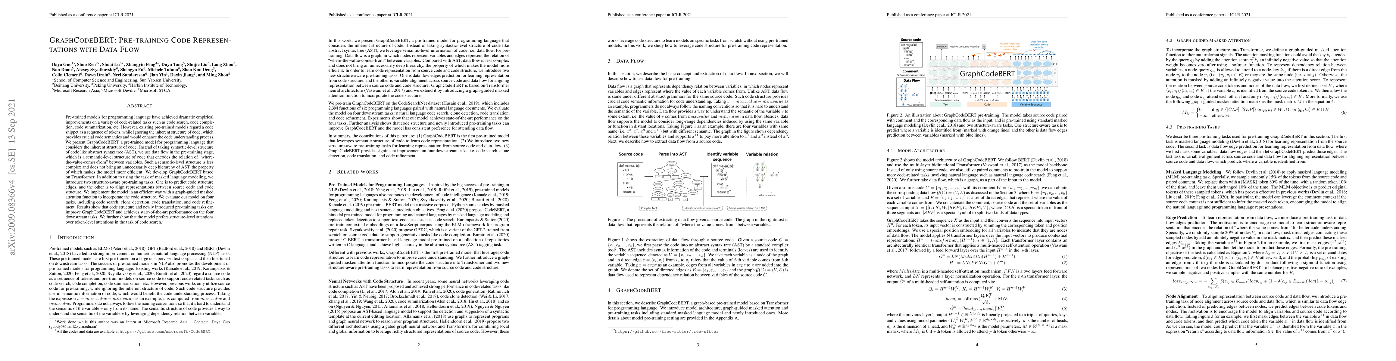 Pre-trained models for programming language have achieved dramatic empirical improvements on a variety of code-related tasks such as code search, code completion, code summarization, etc. However, existing pre-trained models regard a code snippet as a sequence of tokens, while ignoring the inherent structure of code, which provides crucial code semantics and would enhance the code understanding process. We present GraphCodeBERT, a pre-trained model for programming language that considers the inherent structure of code. Instead of taking syntactic-level structure of code like abstract syntax tree (AST), we use data flow in the pre-training stage, which is a semantic-level structure of code that encodes the relation of "where-the-value-comes-from" between variables. Such a semantic-level structure is neat and does not bring an unnecessarily deep hierarchy of AST, the property of which makes the model more efficient. We develop GraphCodeBERT based on Transformer. In addition to using the task of masked language modeling, we introduce two structure-aware pre-training tasks. One is to predict code structure edges, and the other is to align representations between source code and code structure. We implement the model in an efficient way with a graph-guided masked attention function to incorporate the code structure. We evaluate our model on four tasks, including code search, clone detection, code translation, and code refinement. Results show that code structure and newly introduced pre-training tasks can improve GraphCodeBERT and achieves state-of-the-art performance on the four downstream tasks. We further show that the model prefers structure-level attentions over token-level attentions in the task of code search.