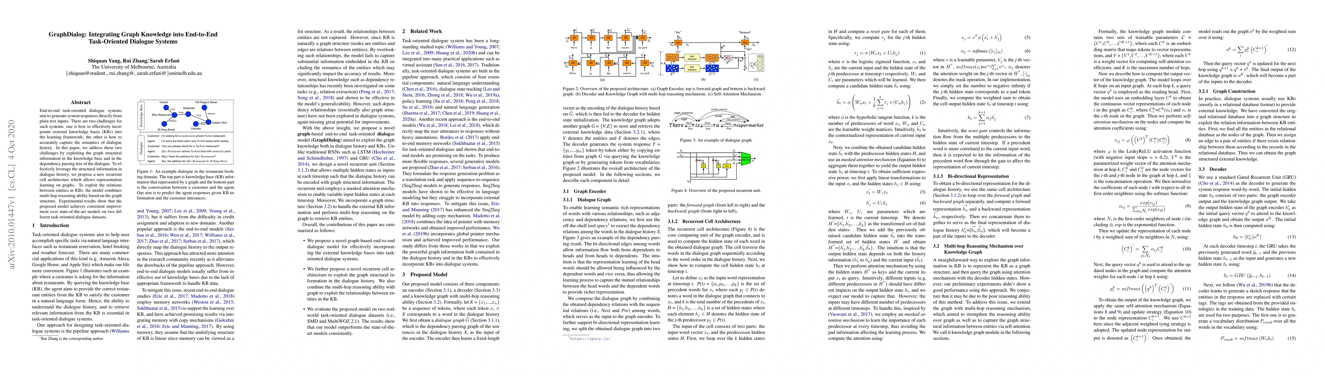**Summary:** This paper proposes GraphDialog, a method that integrates graph knowledge from both knowledge bases and dialogue history to enhance end-to-end task-oriented dialogue systems. It employs a new recurrent cell architecture for effective graph representation learning, demonstrating consistent improvements over existing models on dialogue datasets.