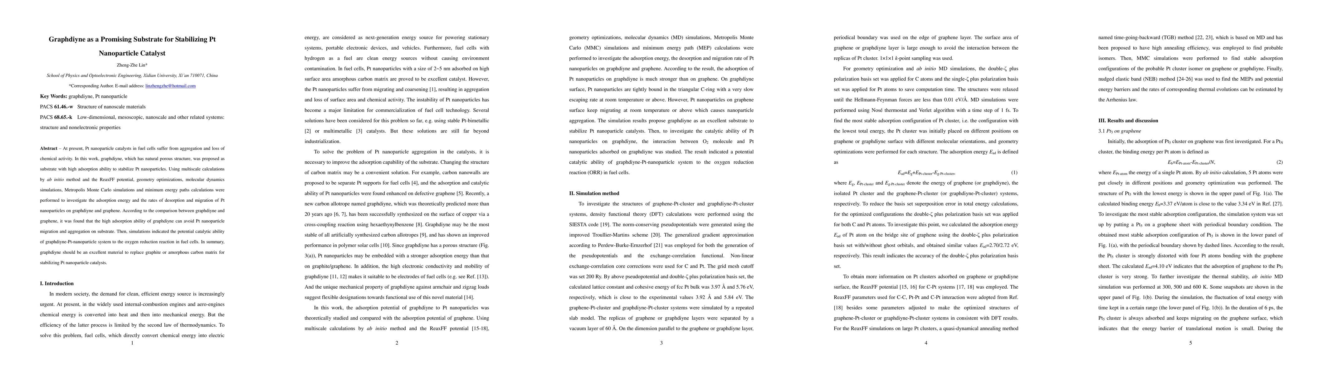 Graphdiyne effectively stabilizes Pt nanoparticles, preventing their aggregation and enhancing catalytic activity for oxygen reduction in fuel cells, according to multiscale simulations comparing it to graphene.