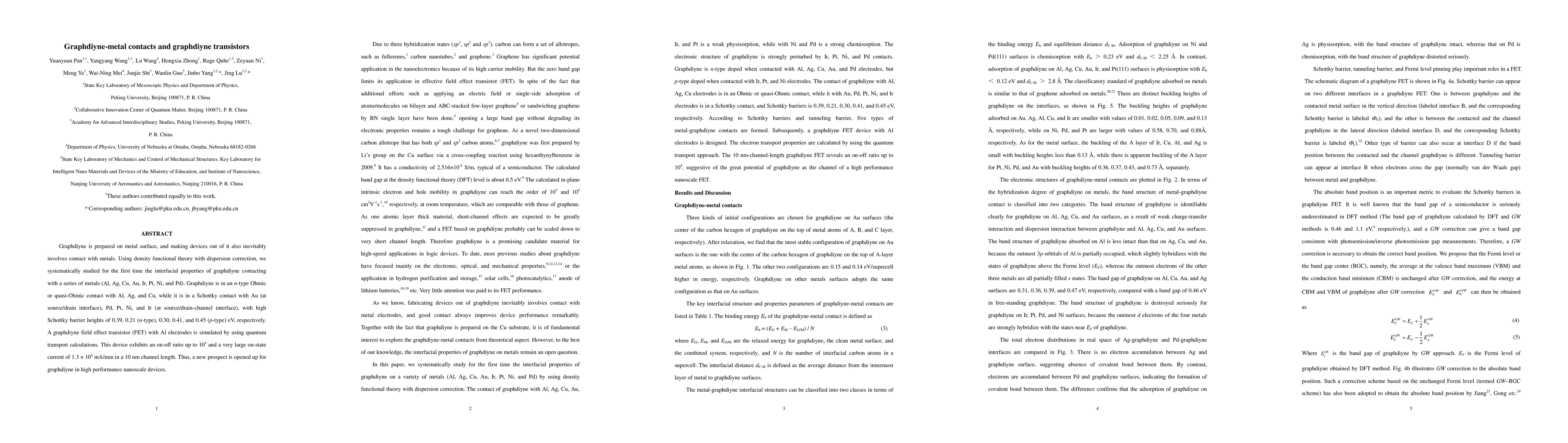 Graphdiyne is prepared on metal surface, and making devices out of it also inevitably involves contact with metals. Using density functional theory with dispersion correction, we systematically studied for the first time the interfacial properties of graphdiyne contacting with a series of metals (Al, Ag, Cu, Au, Ir, Pt, Ni, and Pd). Graphdiyne is in an n-type Ohmic or quasi-Ohmic contact with Al, Ag, and Cu, while it is in a Schottky contact with Au (at source/drain interface), Pd, Pt, Ni, and Ir (at source/drain-channel interface), with high Schottky barrier heights of 0.39, 0.21 (n-type), 0.30, 0.41, and 0.45 (p-type) eV, respectively. A graphdiyne field effect transistor (FET) with Al electrodes is simulated by using quantum transport calculations. This device exhibits an on-off ratio up to 104 and a very large on-state current of 1.3 * 104 mA/mm in a 10 nm channel length. Thus, a new prospect is opened up for graphdiyne in high performance nanoscale devices.