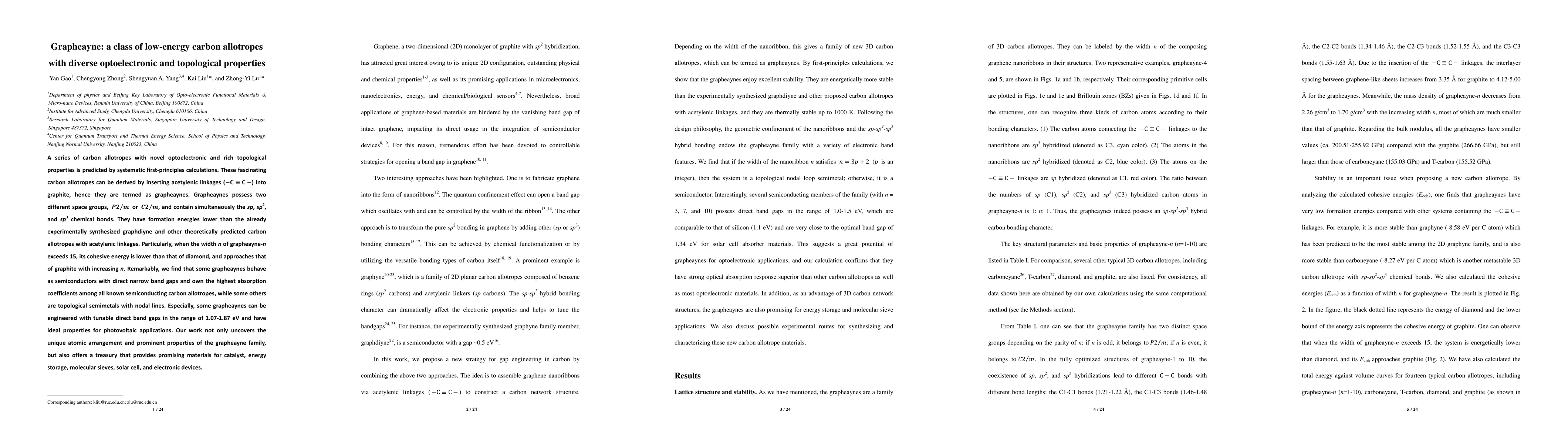 This paper presents a class of low-energy carbon allotropes called grapheaynes, derived by inserting acetylenic linkages into graphite, which exhibit diverse optoelectronic and topological properties. Some grapheaynes show semiconductor behavior with direct band gaps, while others are topological semimetals, making them promising for applications in photovoltaics, catalysis, and electronic devices.