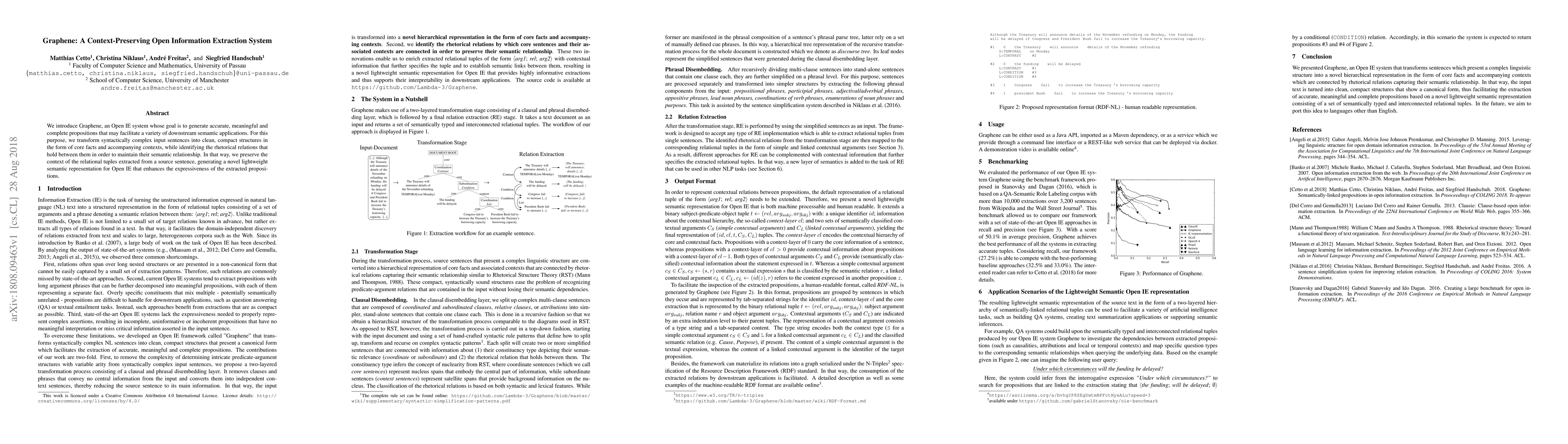 We introduce Graphene, an Open IE system whose goal is to generate accurate, meaningful and complete propositions that may facilitate a variety of downstream semantic applications. For this purpose, we transform syntactically complex input sentences into clean, compact structures in the form of core facts and accompanying contexts, while identifying the rhetorical relations that hold between them in order to maintain their semantic relationship. In that way, we preserve the context of the relational tuples extracted from a source sentence, generating a novel lightweight semantic representation for Open IE that enhances the expressiveness of the extracted propositions.