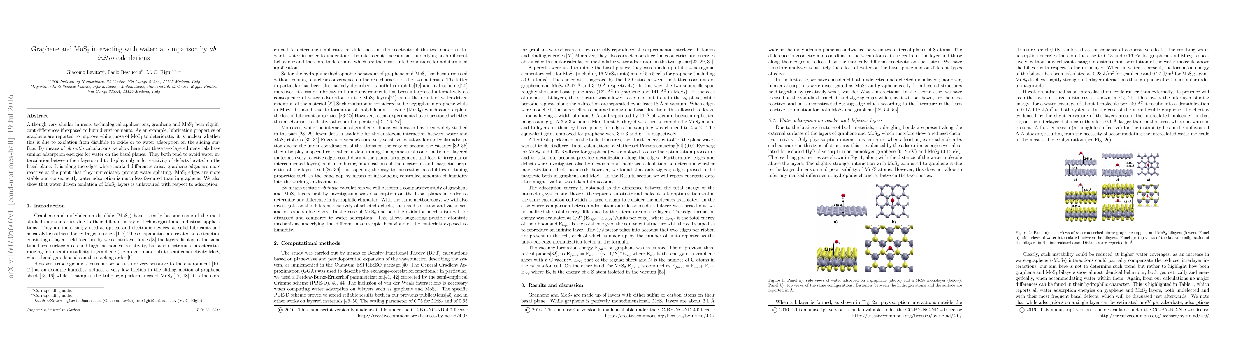 A combination of density functional theory (DFT) calculations and molecular dynamics simulations were used to investigate the adsorption of water on MoS2 surfaces.