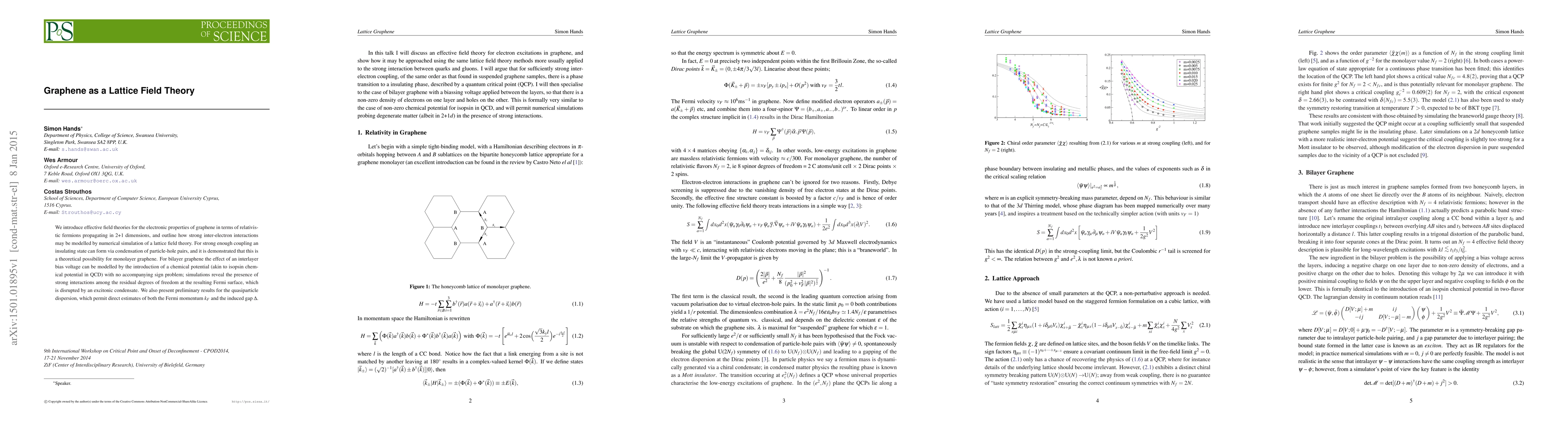We introduce effective field theories for the electronic properties of graphene in terms of relativistic fermions propagating in 2+1 dimensions, and outline how strong inter-electron interactions may be modelled by numerical simulation of a lattice field theory. For strong enough coupling an insulating state can form via condensation of particle-hole pairs, and it is demonstrated that this is a theoretical possibility for monolayer graphene. For bilayer graphene the effect of an interlayer bias voltage can be modelled by the introduction of a chemical potential (akin to isopsin chemical potential in QCD) with no accompanying sign problem; simulations reveal the presence of strong interactions among the residual degrees of freedom at the resulting Fermi surface, which is disrupted by an excitonic condensate. We also present preliminary results for the quasiparticle dispersion, which permit direct estimates of both the Fermi momentum and the induced gap.