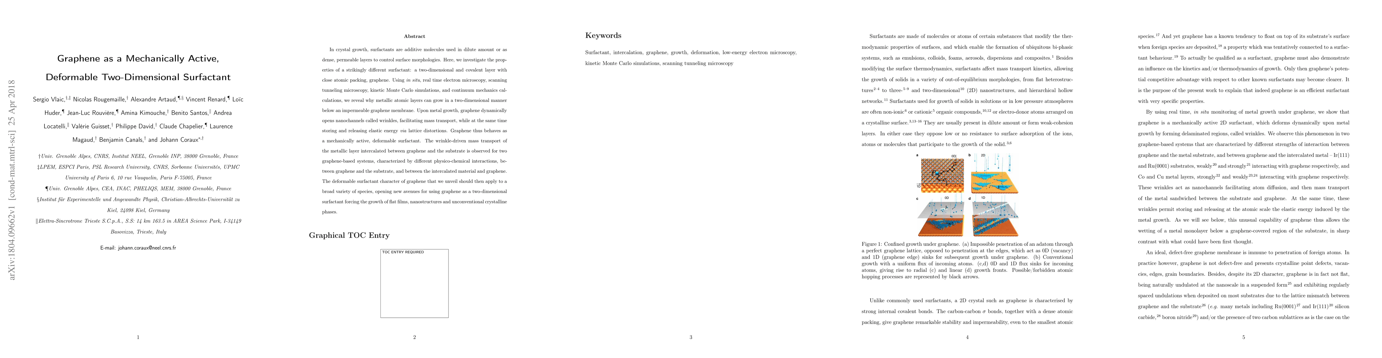 In crystal growth, surfactants are additive molecules used in dilute amount or as dense, permeable layers to control surface morphologies. Here, we investigate the properties of a strikingly different surfactant: a two-dimensional and covalent layer with close atomic packing, graphene. Using in situ, real time electron microscopy, scanning tunneling microscopy, kinetic Monte Carlo simulations, and continuum mechanics calculations, we reveal why metallic atomic layers can grow in a two-dimensional manner below an impermeable graphene membrane. Upon metal growth, graphene dynamically opens nanochannels called wrinkles, facilitating mass transport, while at the same time storing and releasing elastic energy via lattice distortions. Graphene thus behaves as a mechanically active, deformable surfactant. The wrinkle-driven mass transport of the metallic layer intercalated between graphene and the substrate is observed for two graphene-based systems, characterized by different physico-chemical interactions, between graphene and the substrate, and between the intercalated material and graphene. The deformable surfactant character of graphene that we unveil should then apply to a broad variety of species, opening new avenues for using graphene as a two-dimensional surfactant forcing the growth of flat films, nanostructures and unconventional crystalline phases.