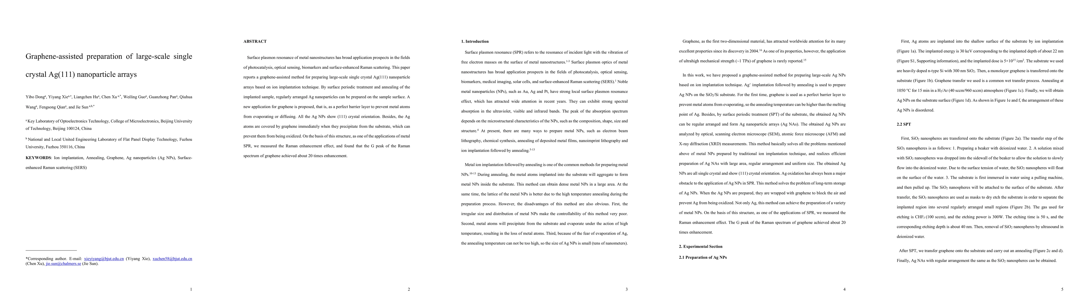 This paper presents a graphene-assisted method for creating large-scale single crystal Ag(111) nanoparticle arrays using ion implantation and annealing. The graphene layer prevents metal atom diffusion and oxidation, achieving significant Raman enhancement.