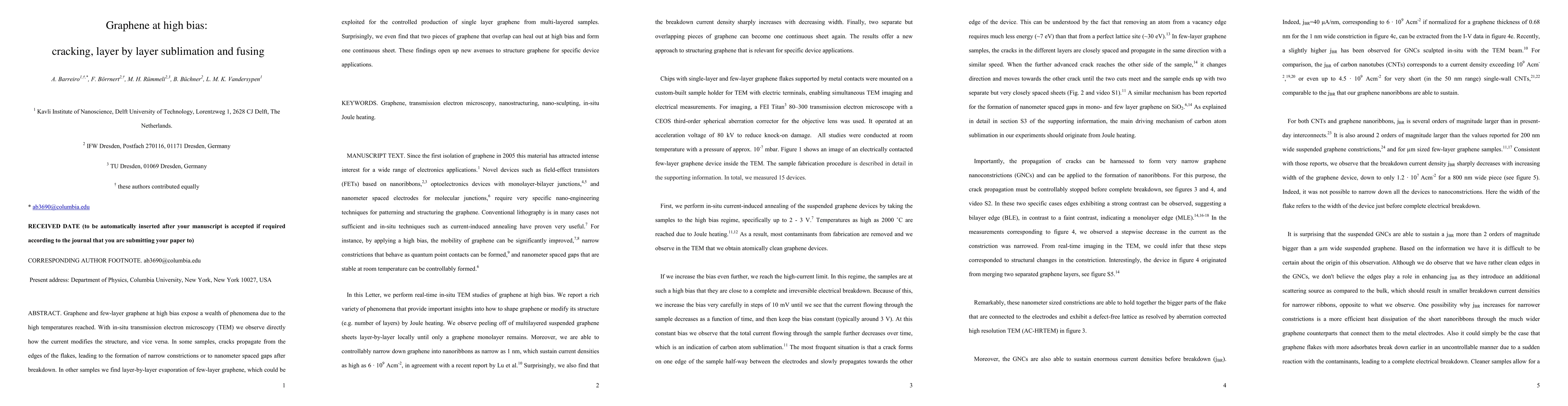 Graphene and few-layer graphene at high bias expose a wealth of phenomena due to the high temperatures reached. With in-situ transmission electron microscopy (TEM) we observe directly how the current modifies the structure, and vice versa. In some samples, cracks propagate from the edges of the flakes, leading to the formation of narrow constrictions or to nanometer spaced gaps after breakdown. In other samples we find layer-by-layer evaporation of few-layer graphene, which could be exploited for the controlled production of single layer graphene from multi-layered samples. Surprisingly, we even find that two pieces of graphene that overlap can heal out at high bias and form one continuous sheet. These findings open up new avenues to structure graphene for specific device applications.