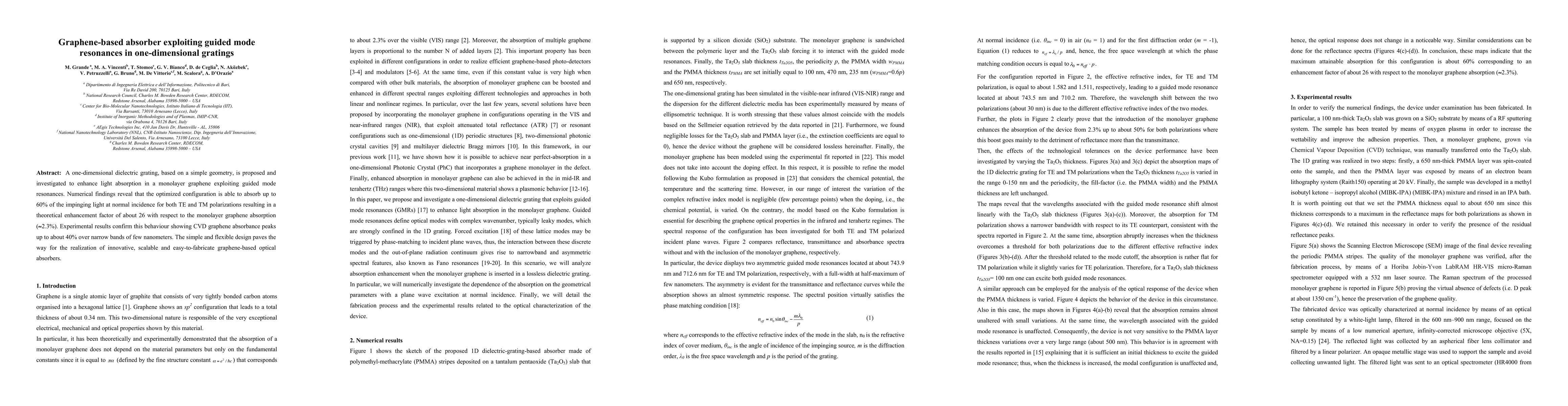 A one-dimensional dielectric grating, based on a simple geometry, is proposed and investigated to enhance light absorption in a monolayer graphene exploiting guided mode resonances. Numerical findings reveal that the optimized configuration is able to absorb up to 60% of the impinging light at normal incidence for both TE and TM polarizations resulting in a theoretical enhancement factor of about 26 with respect to the monolayer graphene absorption (about 2.3%). Experimental results confirm this behaviour showing CVD graphene absorbance peaks up to about 40% over narrow bands of few nanometers. The simple and flexible design paves the way for the realization of innovative, scalable and easy-to-fabricate graphene-based optical absorbers.