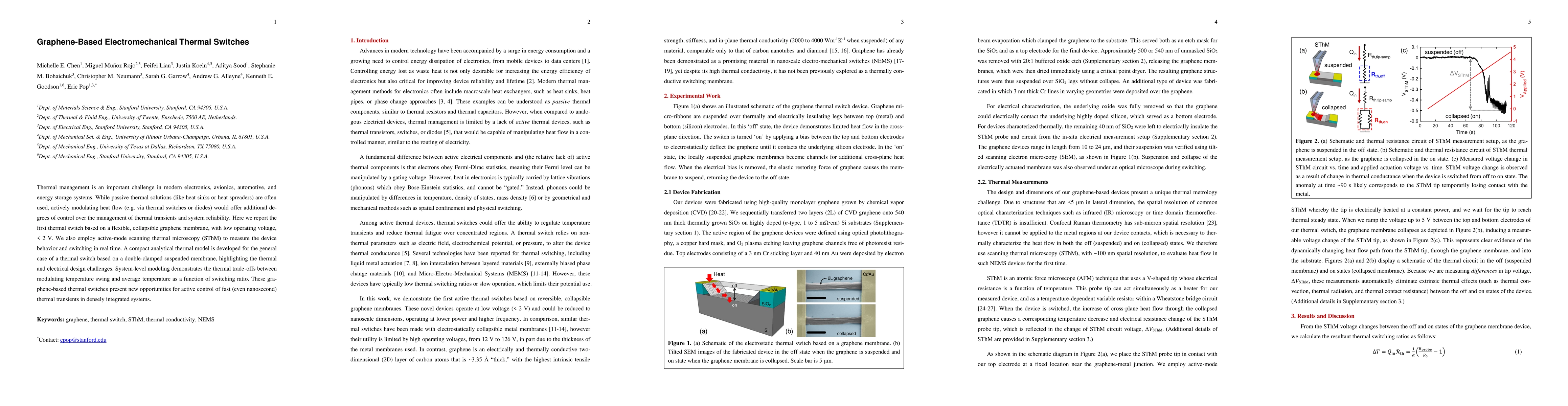 This paper introduces a graphene-based thermal switch with a flexible, collapsible membrane that operates at low voltages (< 2 V). The study demonstrates real-time switching behavior using active-mode scanning thermal microscopy and provides a compact analytical thermal model to address design challenges.
