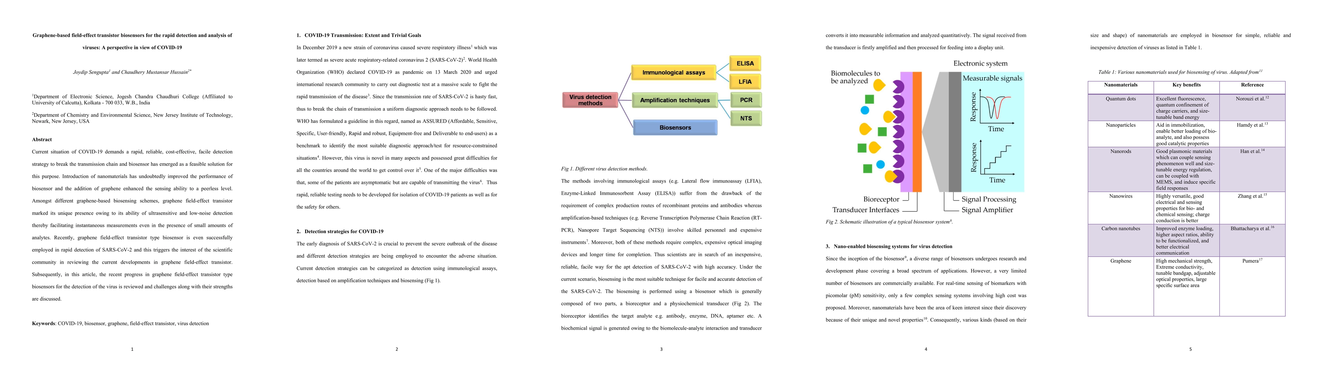 This paper reviews recent advancements in graphene field-effect transistor biosensors for rapid virus detection, highlighting their ultrasensitive and low-noise capabilities, and discusses their application in detecting SARS-CoV-2, along with associated challenges and strengths.
