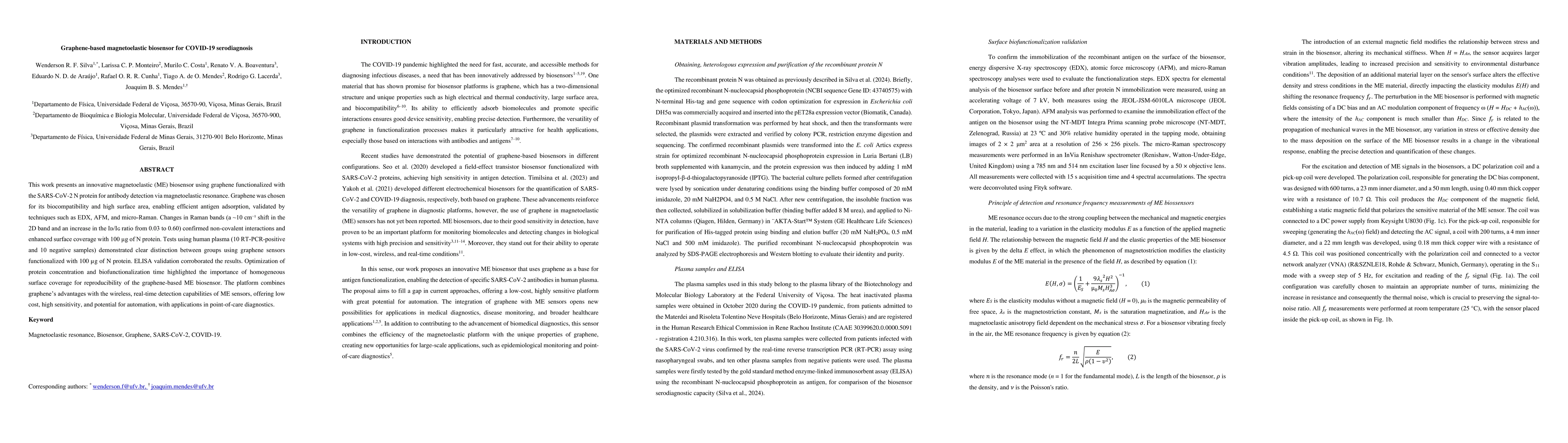A graphene-based magnetoelastic biosensor was developed for COVID-19 serodiagnosis using the SARS-CoV-2 N protein, demonstrating high sensitivity and low cost with potential for automation.