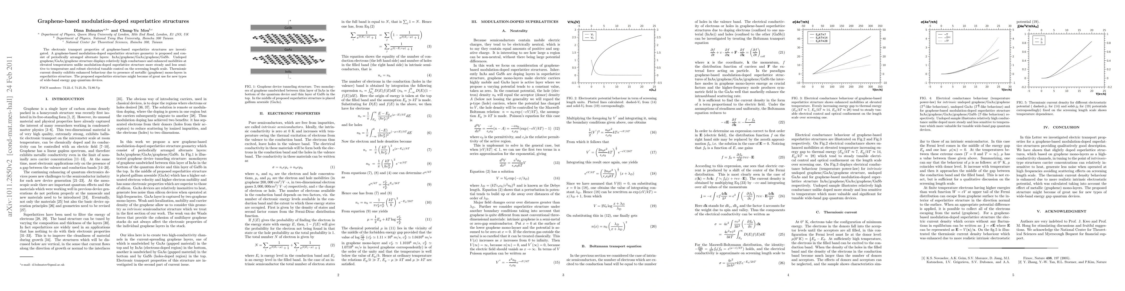 The electronic transport properties of graphene-based superlattice structures are investigated. A graphene-based modulation-doped superlattice structure geometry is proposed and consist of periodically arranged alternate layers: InAs/graphene/GaAs/graphene/GaSb. Undoped graphene/GaAs/graphene structure displays relatively high conductance and enhanced mobilities at elevated temperatures unlike modulation-doped superlattice structure more steady and less sensitive to temperature and robust electrical tunable control on the screening length scale. Thermionic current density exhibits enhanced behaviour due to presence of metallic (graphene) mono-layers in superlattice structure. The proposed superlattice structure might become of great use for new types of wide-band energy gap quantum devices.
