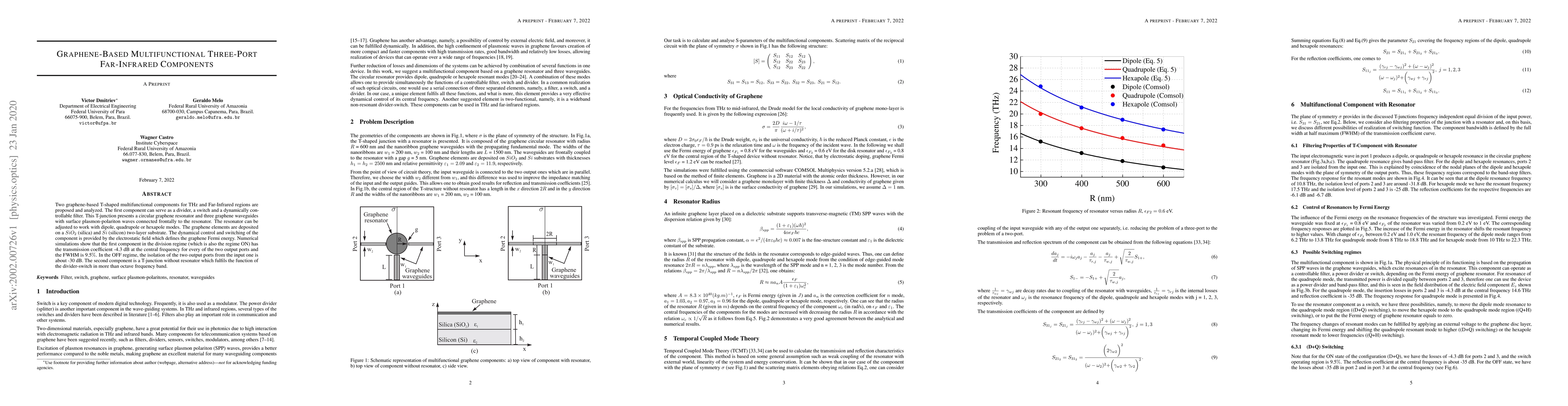 Two graphene-based T-shaped multifunctional components for THz and Far-Infrared regions are proposed and analyzed. The first component can serve as a divider, a switch and a dynamically controllable filter. This T-junction presents a circular graphene resonator and three graphene waveguides with surface plasmon-polariton waves connected frontally to the resonator. The resonator can be adjusted to work with dipole, quadrupole or hexapole modes. The graphene elements are deposited on a $SiO_{2}$ (silica) and $Si$ (silicon) two-layer substrate. The dynamical control and switching of the component is provided by the electrostatic field which defines the graphene Fermi energy. Numerical simulations show that the first component in the division regime (which is also the regime ON) has the transmission coefficient -4.3 dB at the central frequency for every of the two output ports and the FWHM is 9.5$\%$. In the OFF regime, the isolation of the two output ports from the input one is about -30 dB. The second component is a T-junction without resonator which fulfils the function of the divider-switch in more than octave frequency band.