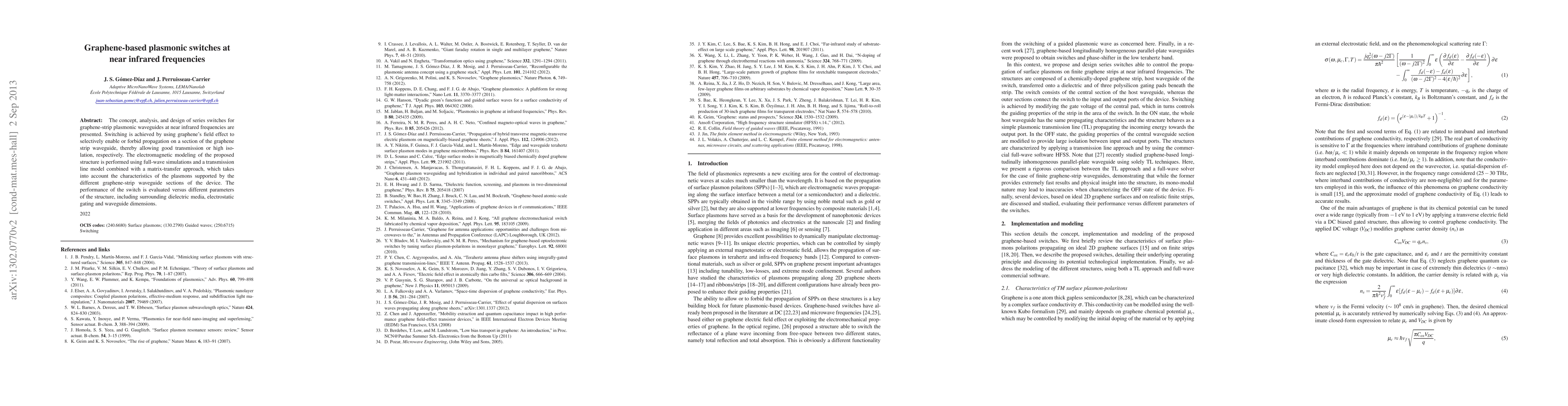 This paper presents the design and analysis of graphene-based plasmonic switches operating at near infrared frequencies, utilizing graphene's field effect for selective propagation control. The performance is evaluated through electromagnetic modeling and simulations, considering various structural parameters.