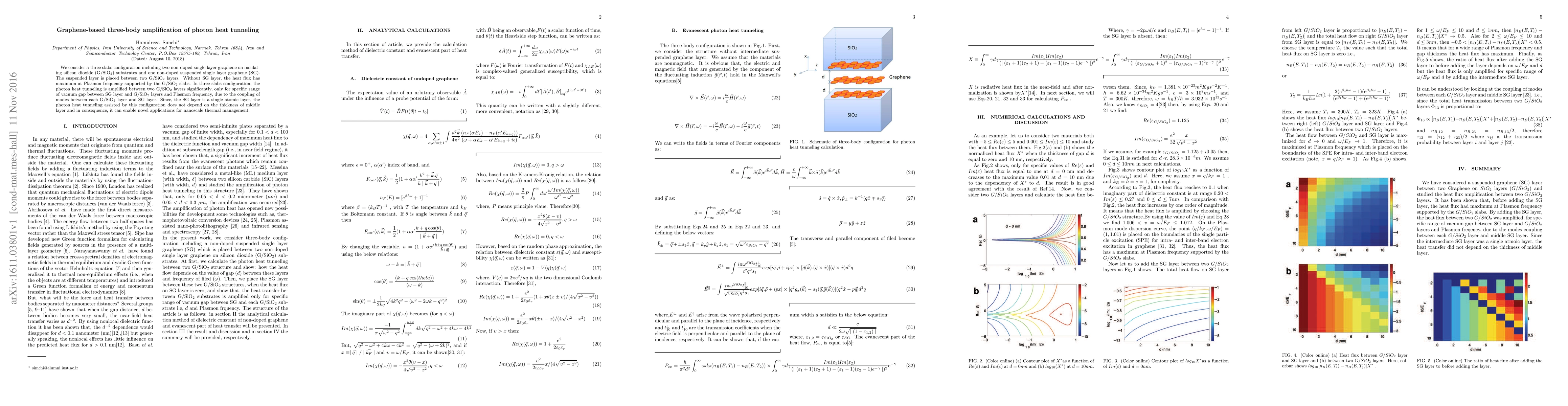 We consider a three slabs configuration including two non-doped single layer graphene on insulating silicon dioxide (G/SiO2) substrates and one non-doped suspended single layer graphene (SG). The suspended layer is placed between two G/SiO2 layers. Without SG layer, the heat flux has maximum at Plasmon frequency supported by the G/SiO2 slabs. In three slabs configuration, the photon heat tunneling is amplified between two G/SiO2 layers significantly, only for specific range of vacuum gap between SG layer and G/SiO2 layers and Plasmon frequency, due to the coupling of modes between each G/SiO2 layer and SG layer. Since, the SG layer is a single atomic layer, the photon heat tunneling assisted by this configuration does not depend on the thickness of middle layer and in consequence, it can enable novel applications for nanoscale thermal management.