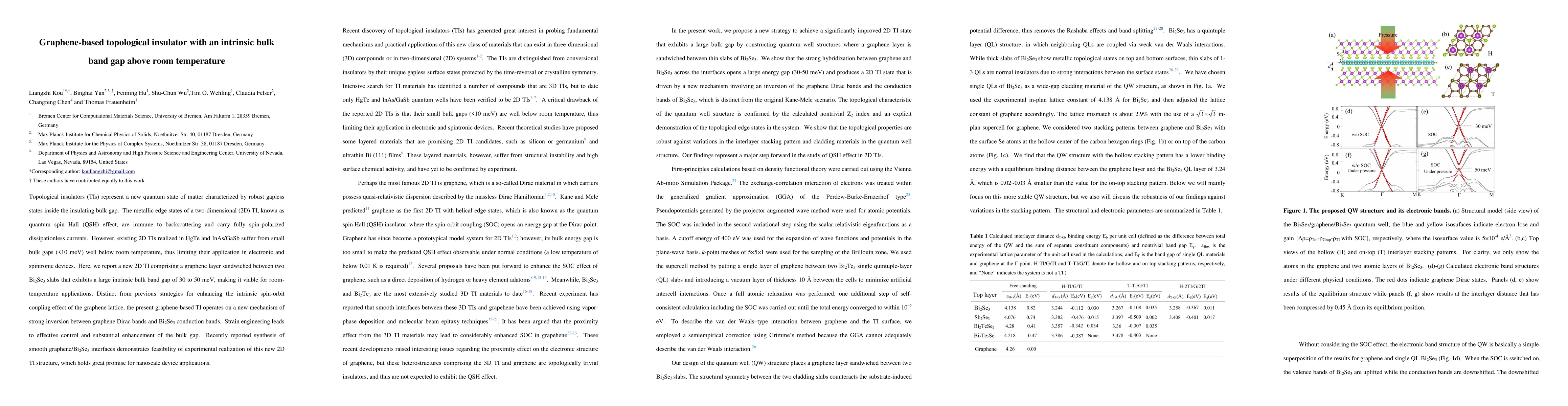 Topological insulators (TIs) represent a new quantum state of matter characterized by robust gapless states inside the insulating bulk gap. The metallic edge states of a two-dimensional (2D) TI, known as quantum spin Hall (QSH) effect, are immune to backscattering and carry fully spin-polarized dissipationless currents. However, existing 2D TIs realized in HgTe and InAs/GaSb suffer from small bulk gaps (<10 meV) well below room temperature, thus limiting their application in electronic and spintronic devices. Here, we report a new 2D TI comprising a graphene layer sandwiched between two Bi2Se3 slabs that exhibits a large intrinsic bulk band gap of 30 to 50 meV, making it viable for room-temperature applications. Distinct from previous strategies for enhancing the intrinsic spin-orbit coupling effect of the graphene lattice, the present graphene-based TI operates on a new mechanism of strong inversion between graphene Dirac bands and Bi2Se3 conduction bands. Strain engineering leads to effective control and substantial enhancement of the bulk gap. Recently reported synthesis of smooth graphene/Bi2Se3 interfaces demonstrates feasibility of experimental realization of this new 2D TI structure, which holds great promise for nanoscale device applications.