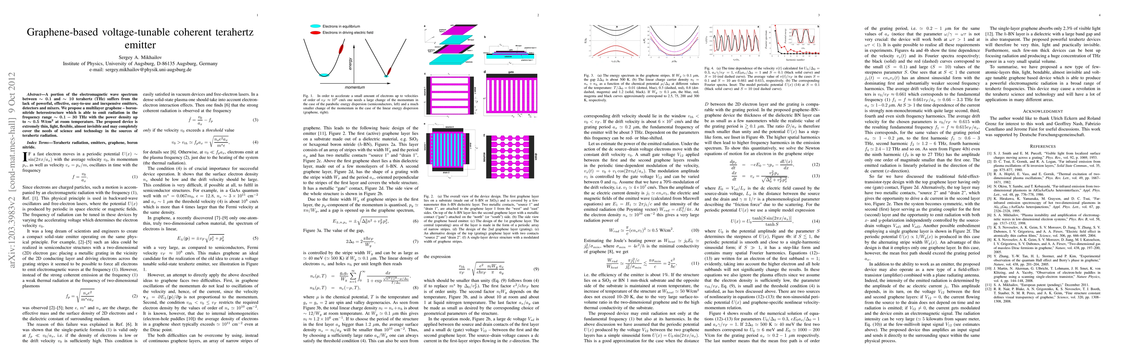 This research proposes a graphene-boron-nitride heterostructure for a voltage-tunable, coherent terahertz emitter operating from 0.1 to 30 THz with high power density up to 0.5 W/cm² at room temperature, addressing the current lack of effective terahertz sources. The device is thin, flexible, and potentially inexpensive, offering a versatile solution for terahertz technology.